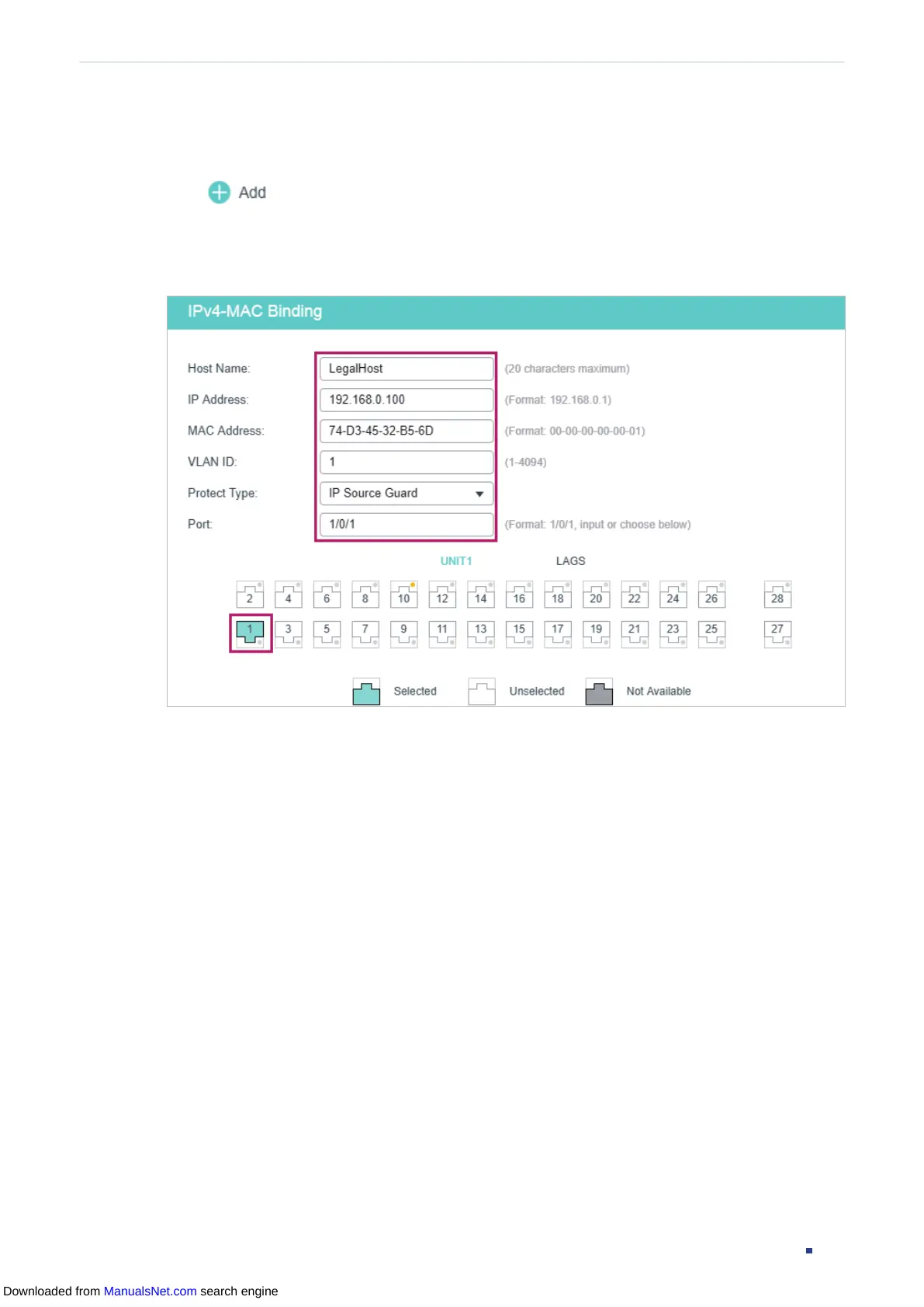 1) Choose the menu SECURITY > IPv4 IMPB > IP-MAC Binding > Manual Binding and