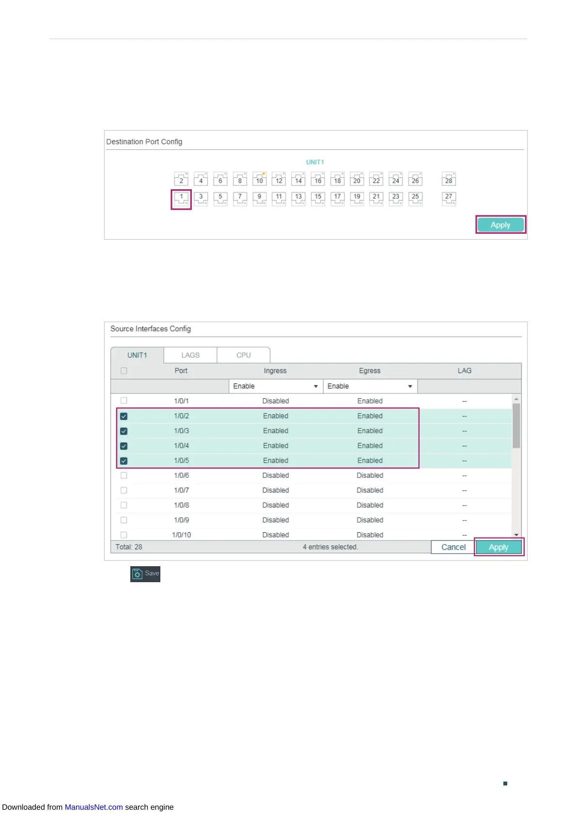 3) In the Source Interfaces Config section, select ports 1/0/2-5 as the source ports, and