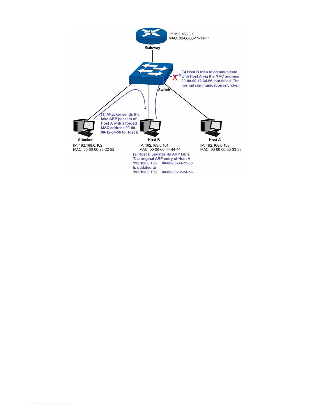 As the above figure shown, the attacker sends the fake ARP packets of Host A to Host B, and then