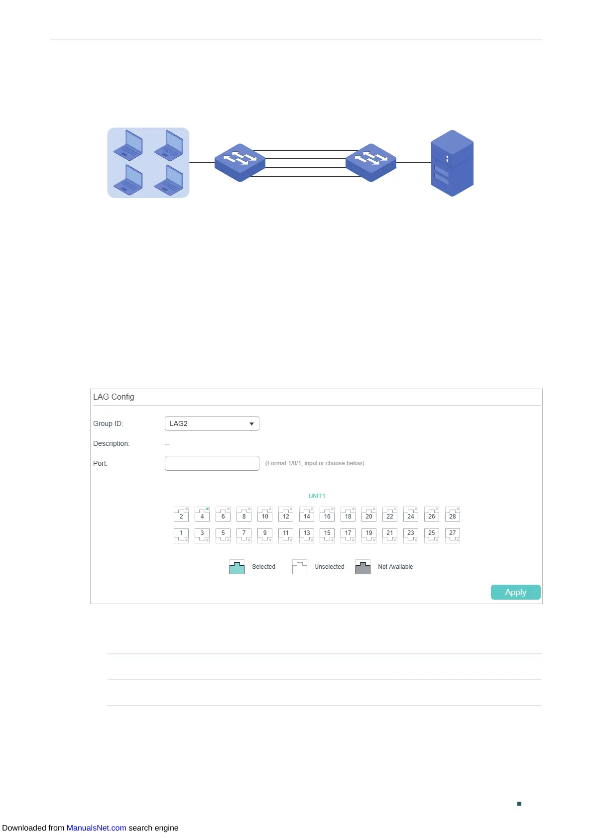 Choose the menu L2 FEATURES > Switching > LAG > Static LAG to load the following