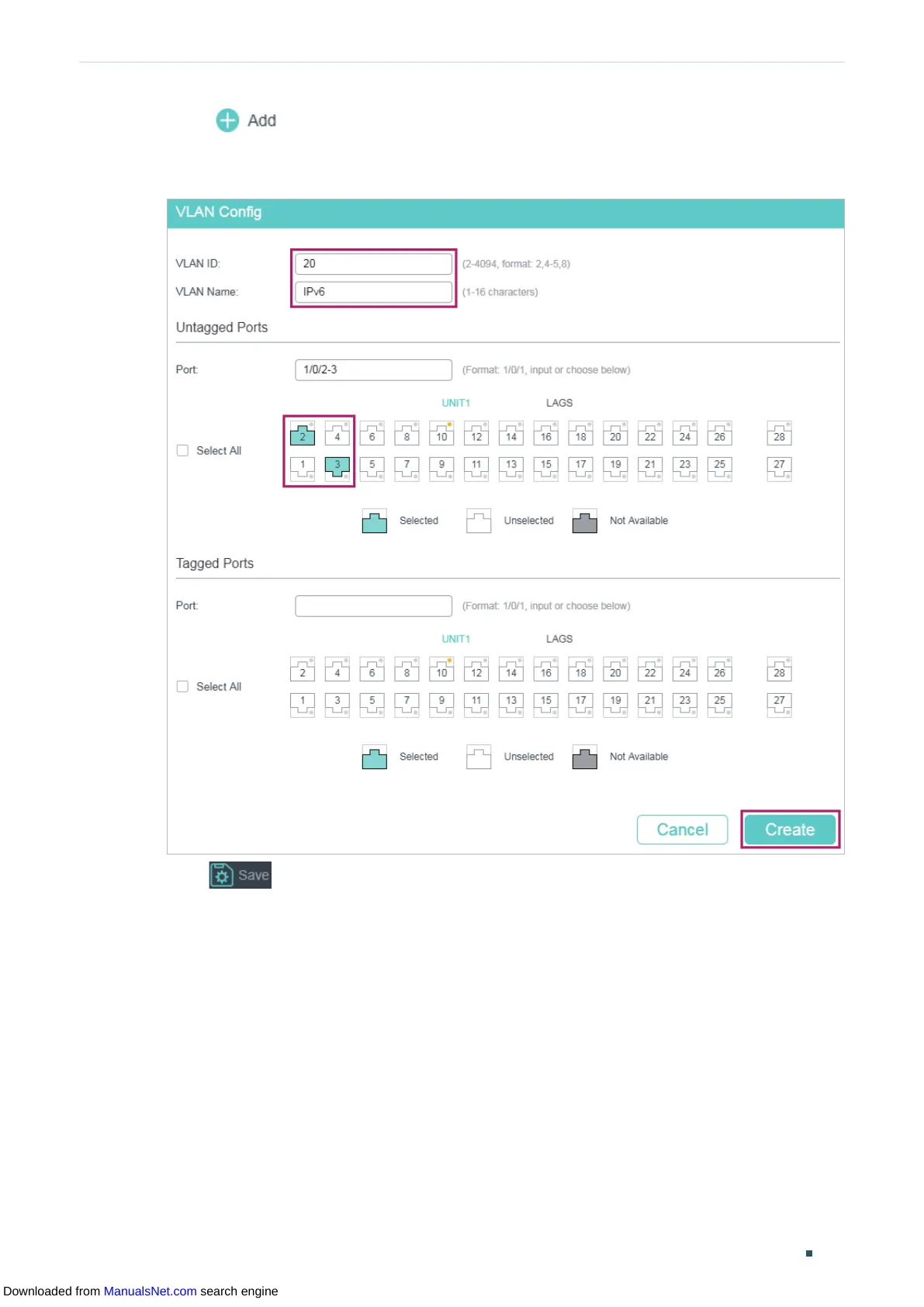 1/0/2-3 to VLAN 20. Click Create.