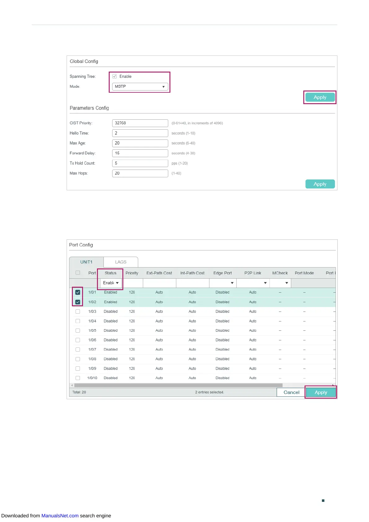 the following page. Enable spanning tree function on port 1/0/1 and port 1/0/2. Here we