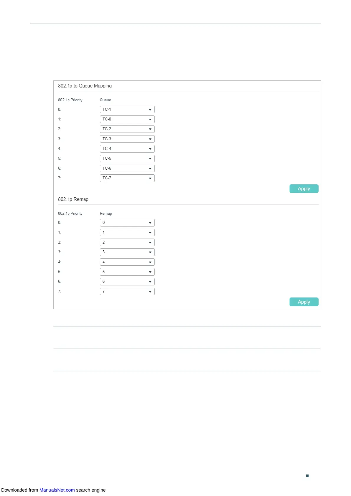 In the 802.1p to Queue Mapping section, configure the mappings and click Apply.