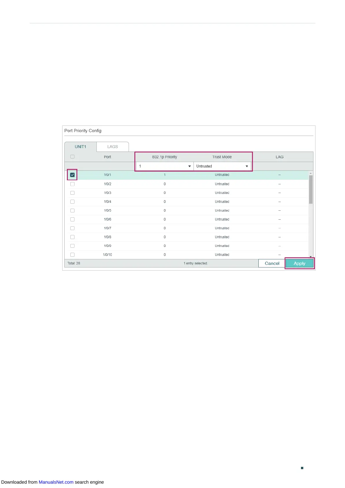 port 1/0/1 as 1 and specify the 802.1p priority of port 1/0/2 as 0. Click Apply.