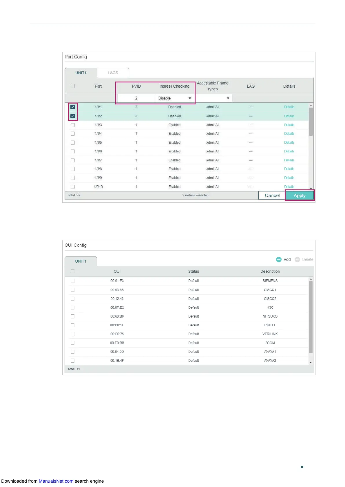 4) Choose the menu QoS > Voice VLAN > OUI Config to load the following page. Check