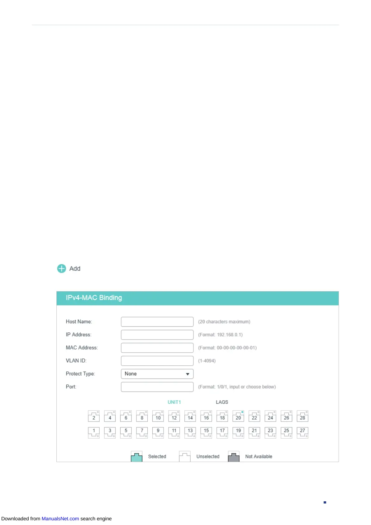Choose the menu SECURITY > IPv4 IMPB > IP-MAC Binding > Manual Binding and click