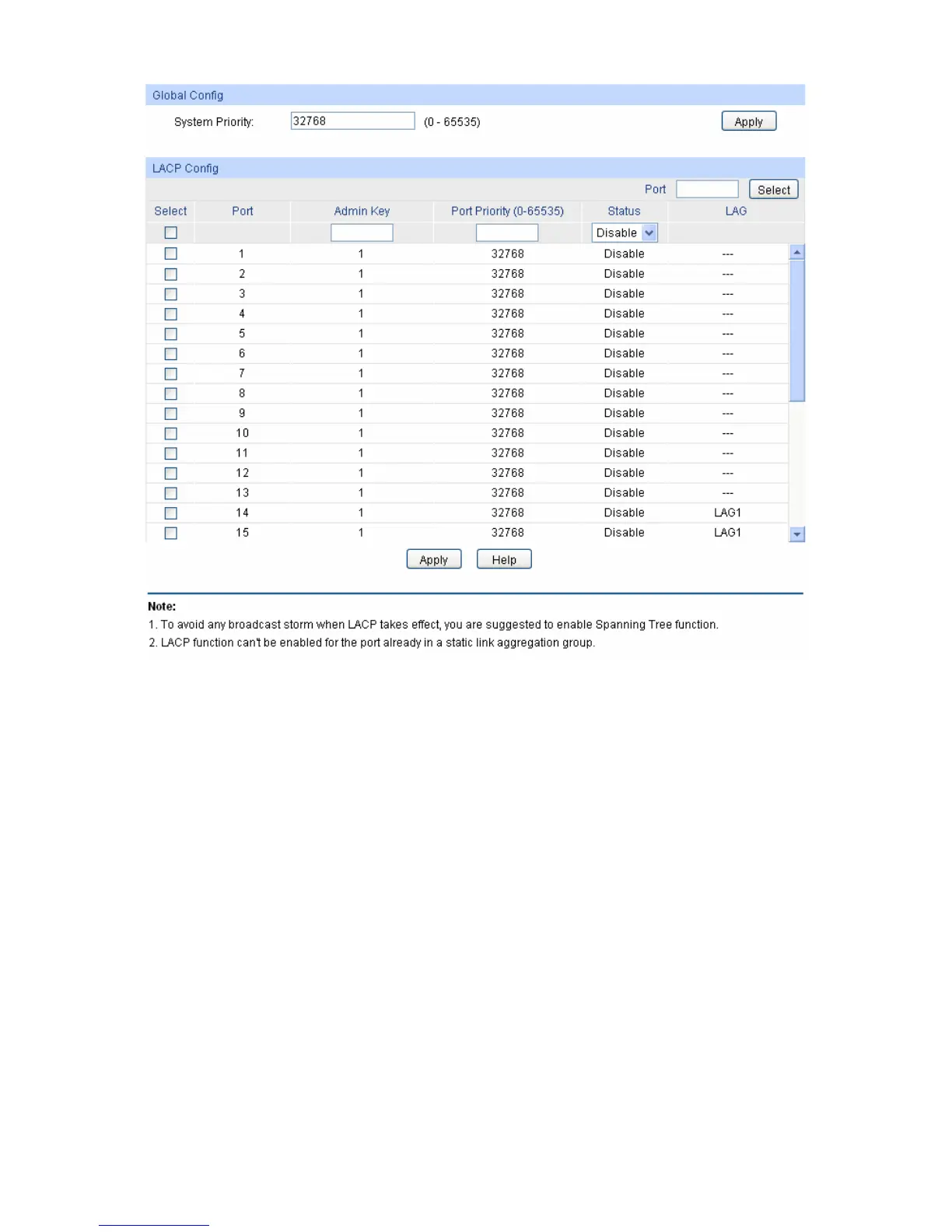 Select: Select the desired port for LACP configuration. It is multi-optional.