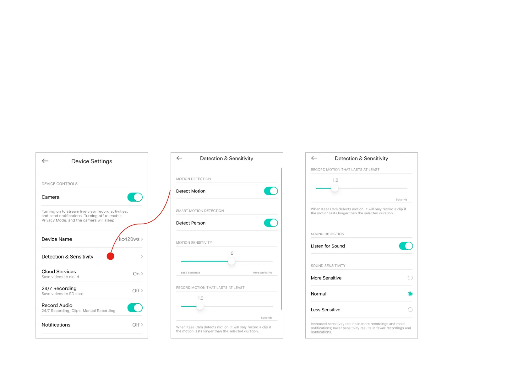 TP-Link Kasa Cam Outdoor - Device Settings: Detection Options; Motion and Sound Detection Configuration