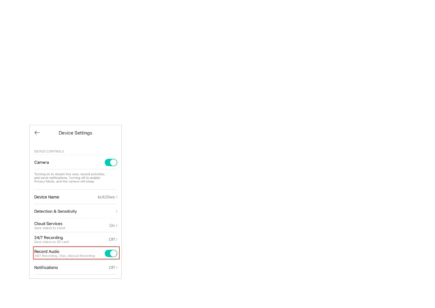 TP-Link Kasa Cam Outdoor - Device Settings: Audio Recording; Enabling Audio Recording