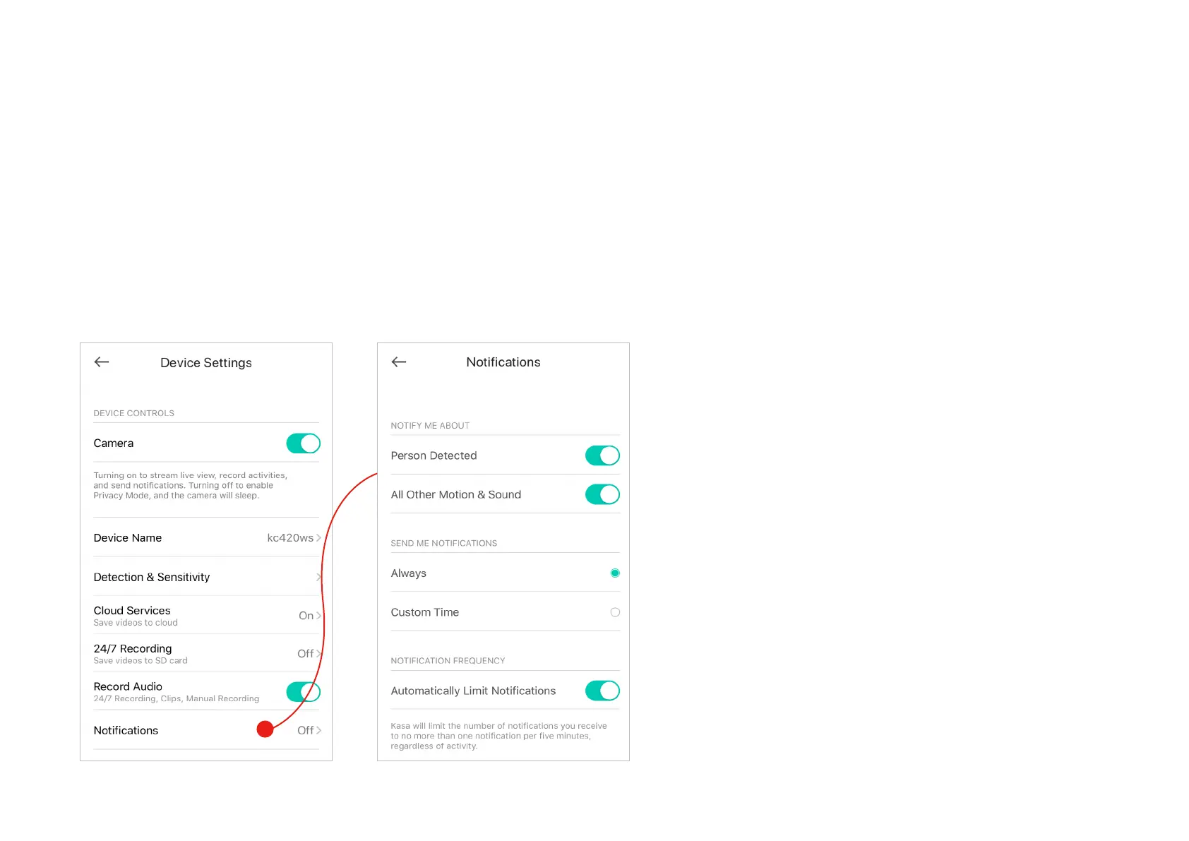 TP-Link Kasa Cam Outdoor - Device Settings: Notifications; Notification Preferences and Frequency
