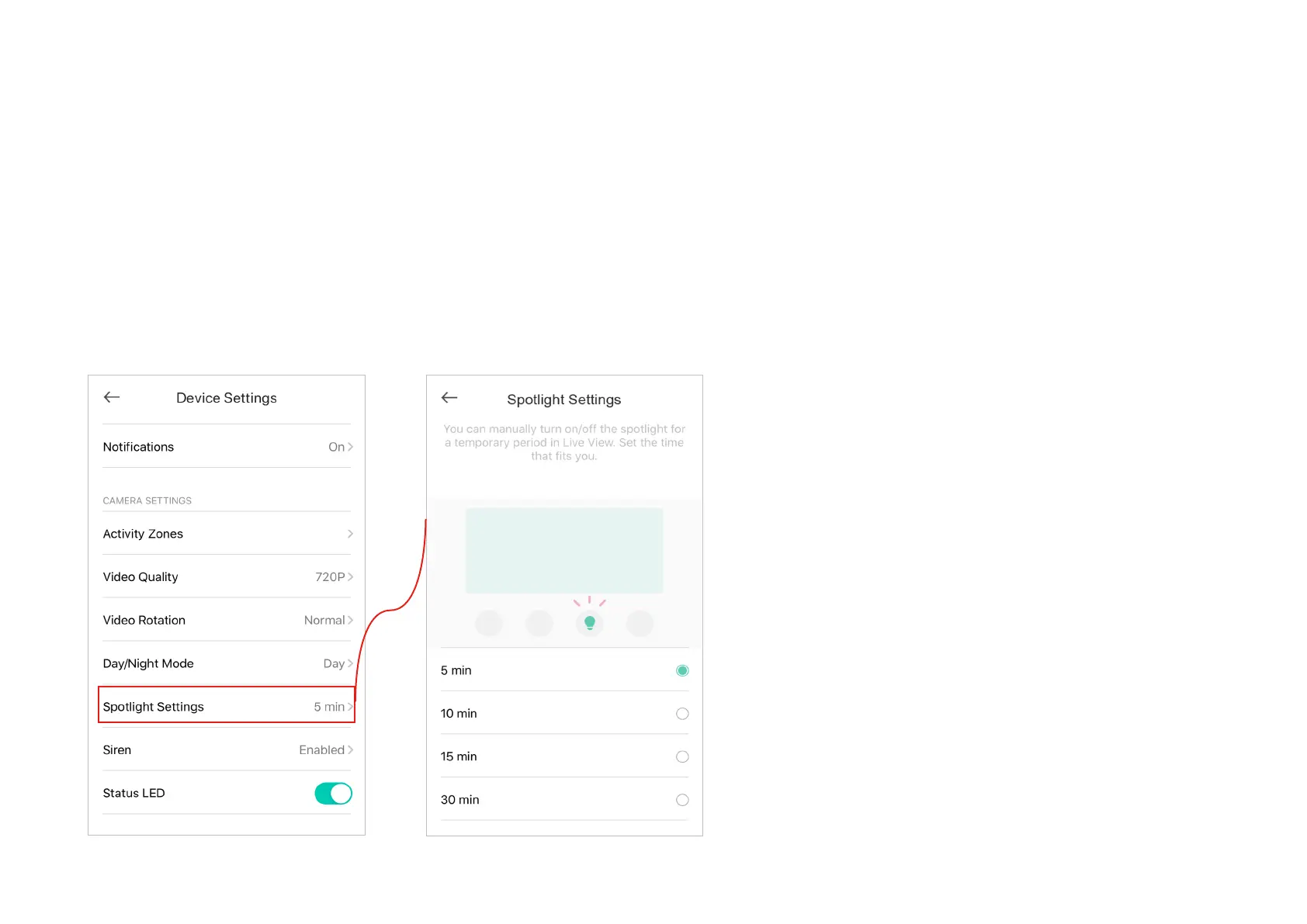 TP-Link Kasa Cam Outdoor - Device Settings: Spotlight Behavior; Customizing Spotlight Duration