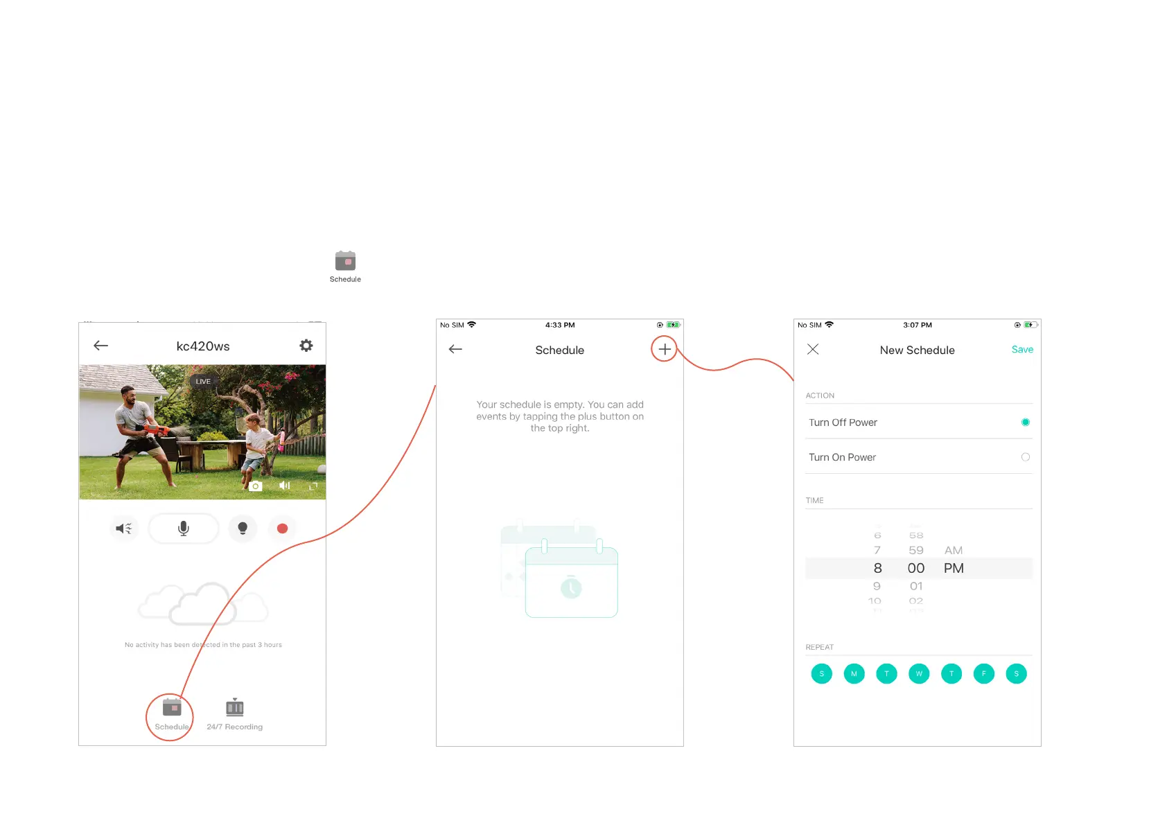 2. Tap + on the top right corner. 3. Set a schedule to turn your camera on or