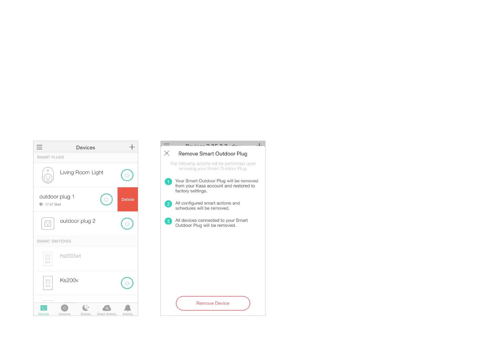 Swipe left either outlet your Smart Outdoor Plug and tap Delete. Then tap Remove Device. Your Smart Outdoor Plug will be removed from your Kasa
