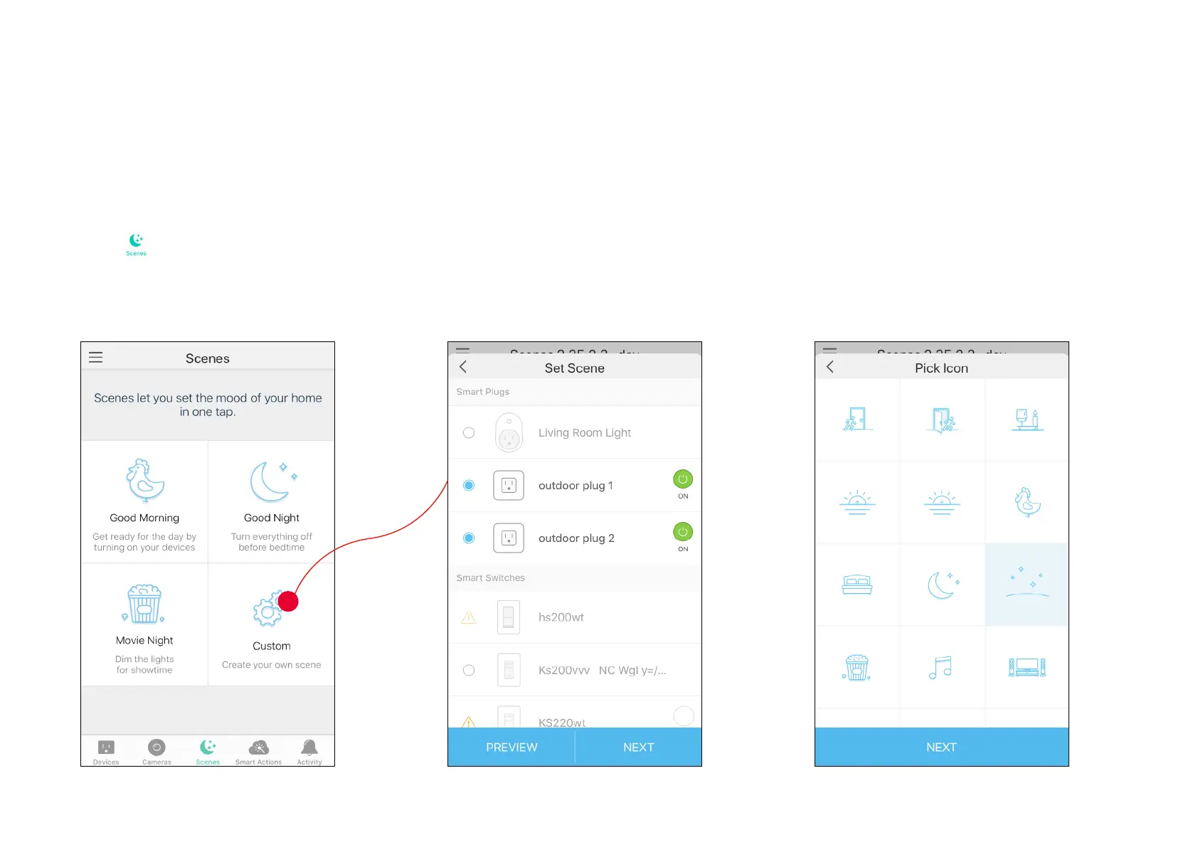 A scene is a preset group of smart devices that can be programmed, customized and activated simultaneously at the touch of a button from your
