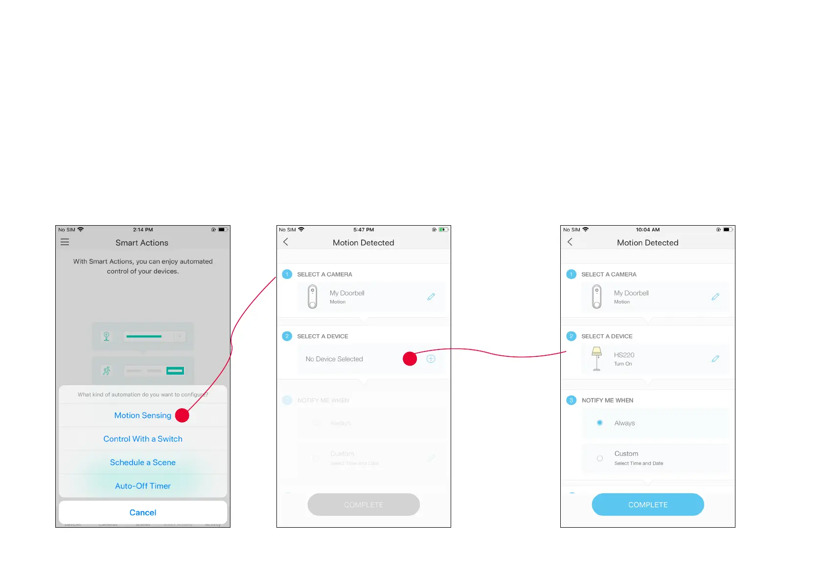 1. Tap Motion Sensing then select your doorbell. 2. Select your Smart Light Switch.