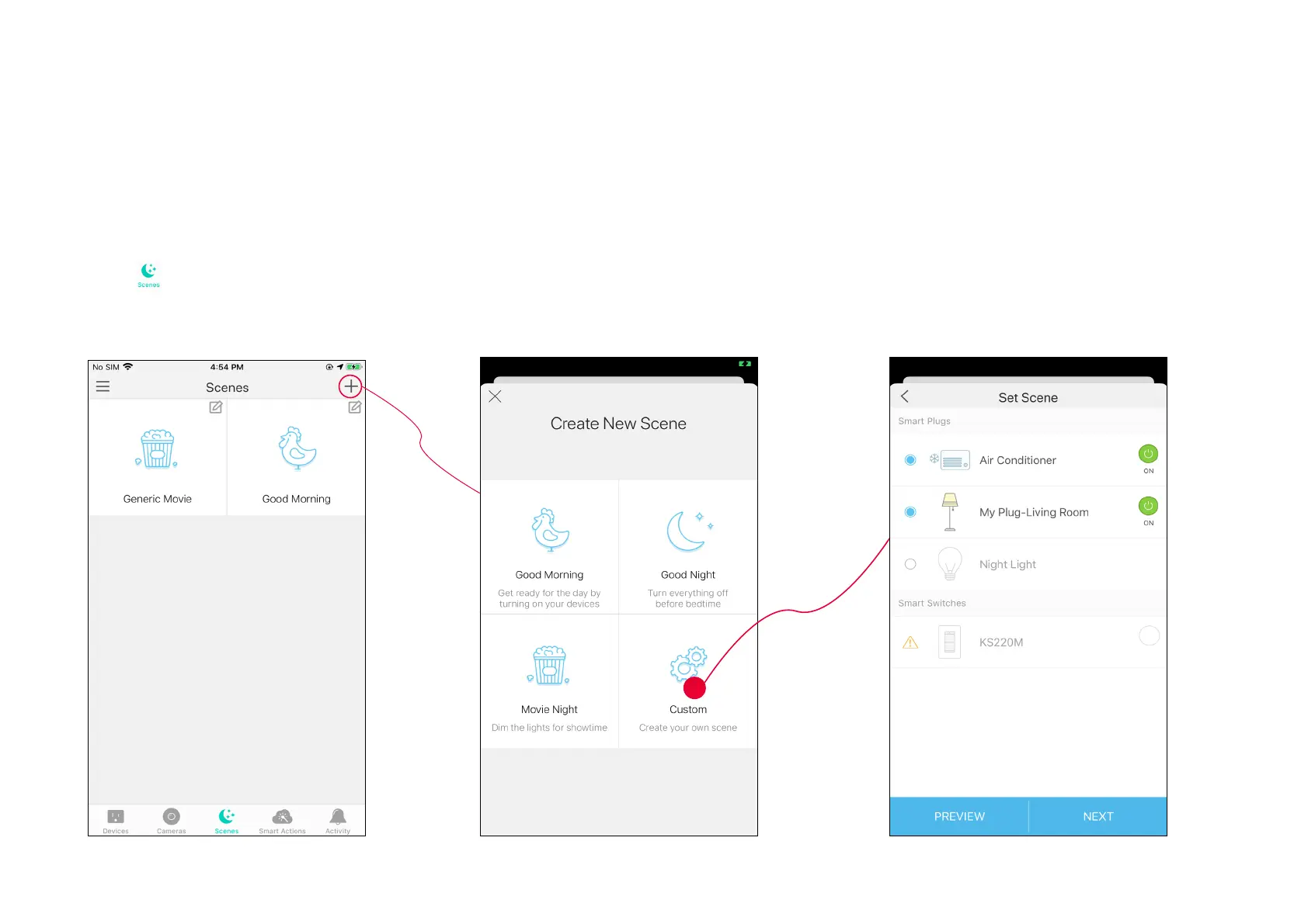 A scene is a preset group of smart devices that can be programmed, customized and activated simultaneously at the touch of a button from your