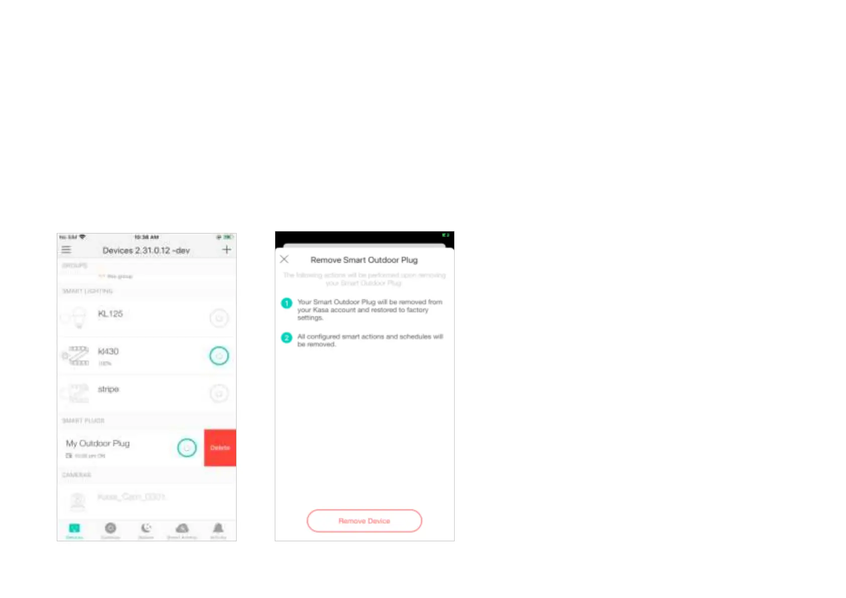 Swipe left your Smart Outdoor Plug and tap Delete. Then tap Remove Device. Your Smart Outdoor Plug will be removed from your Kasa account and