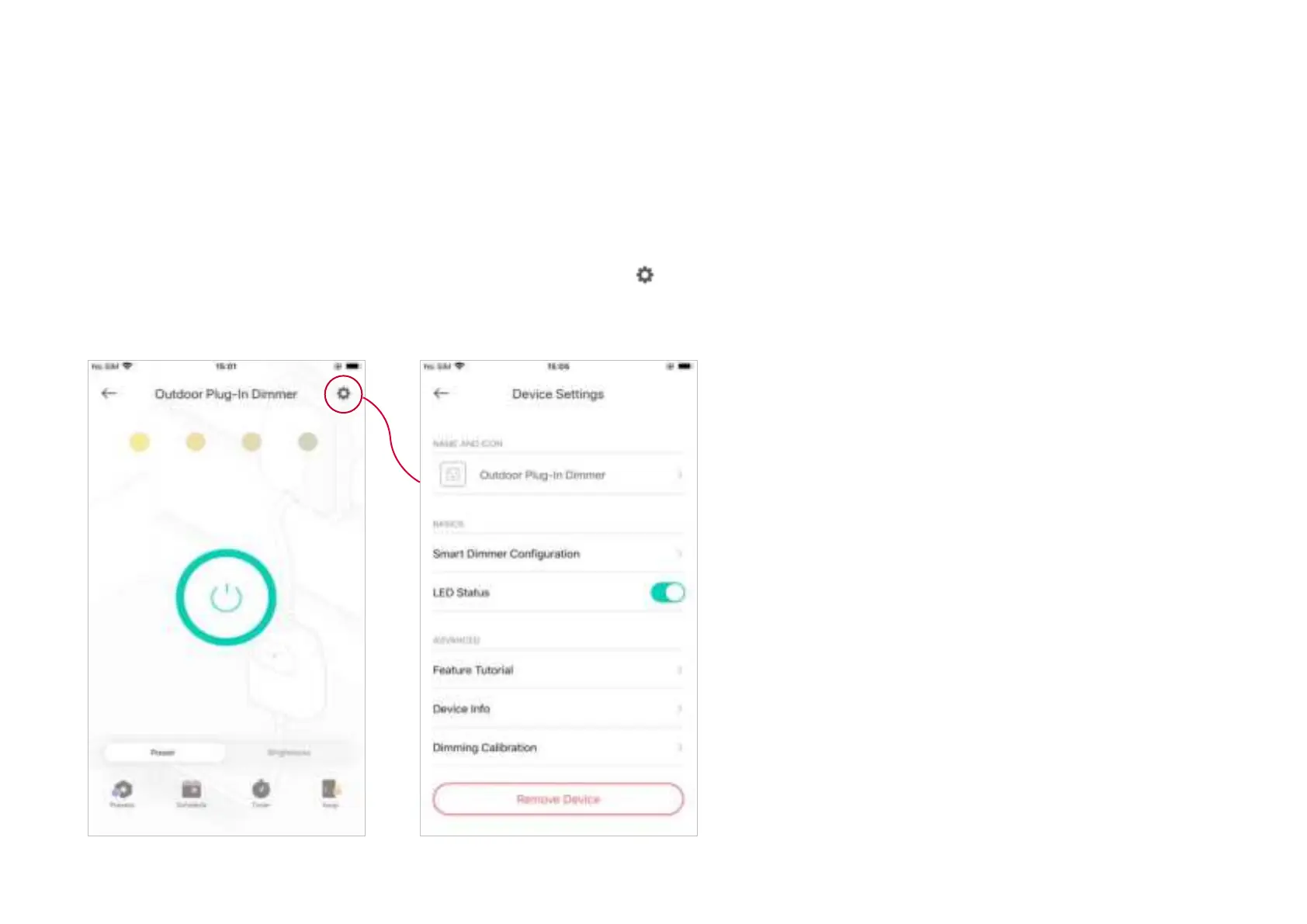 Tap your Smart Outdoor Plug-in Dimmer in the Home page and then tap to enter the Device Settings page.