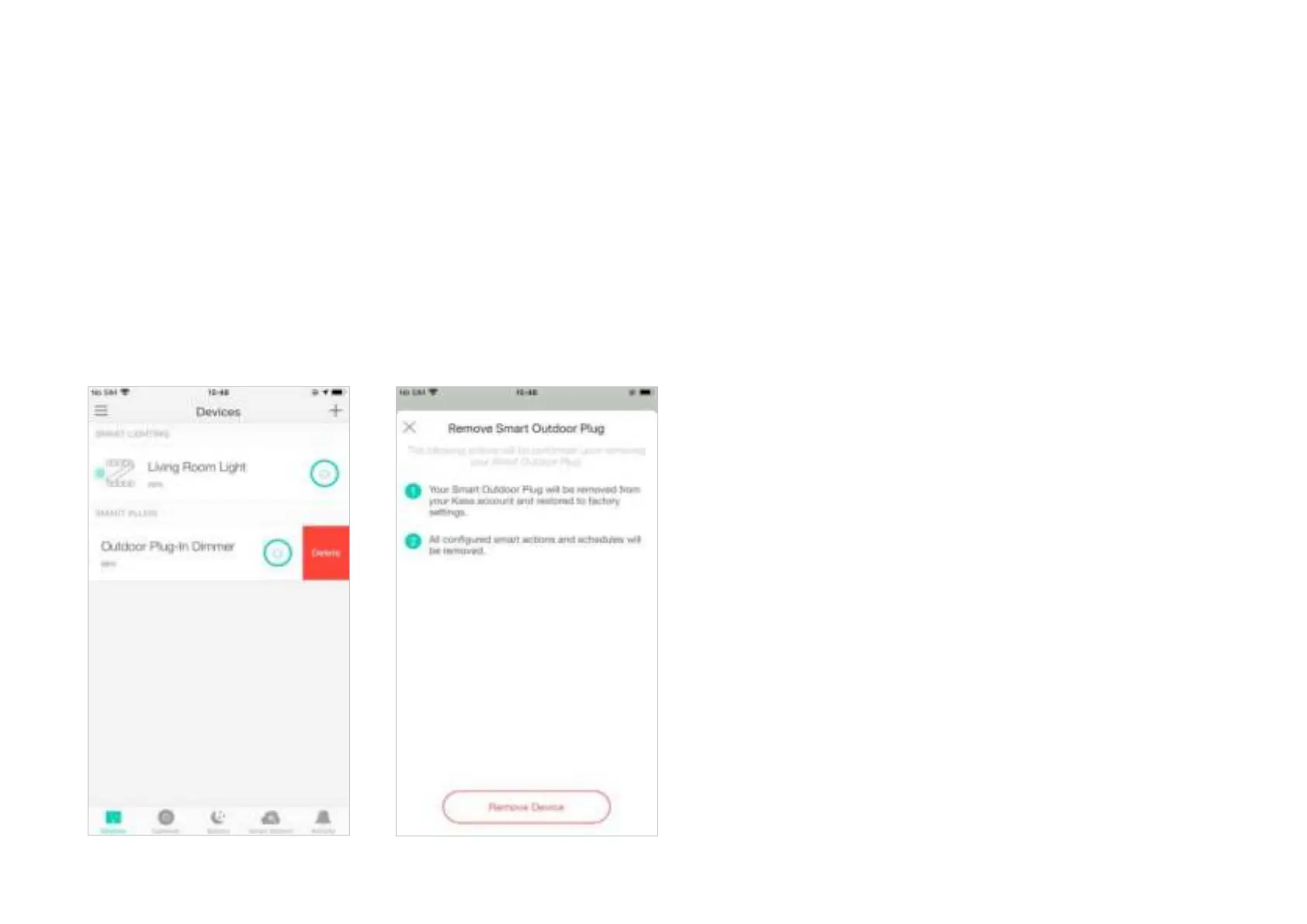 Swipe left your Smart Outdoor Plug-in Dimmer and tap Delete. Then tap Remove Device. Your device will be removed from your Kasa account and