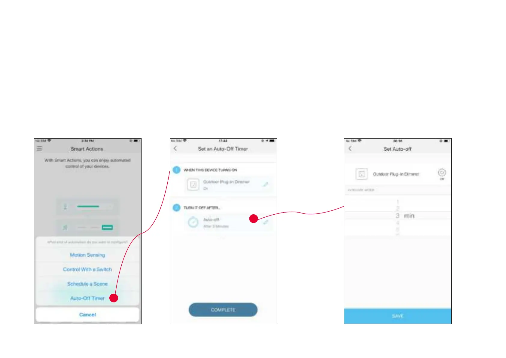 1. Tap Auto-O Timer then select your plug-in dimmer. 2. Set the time.