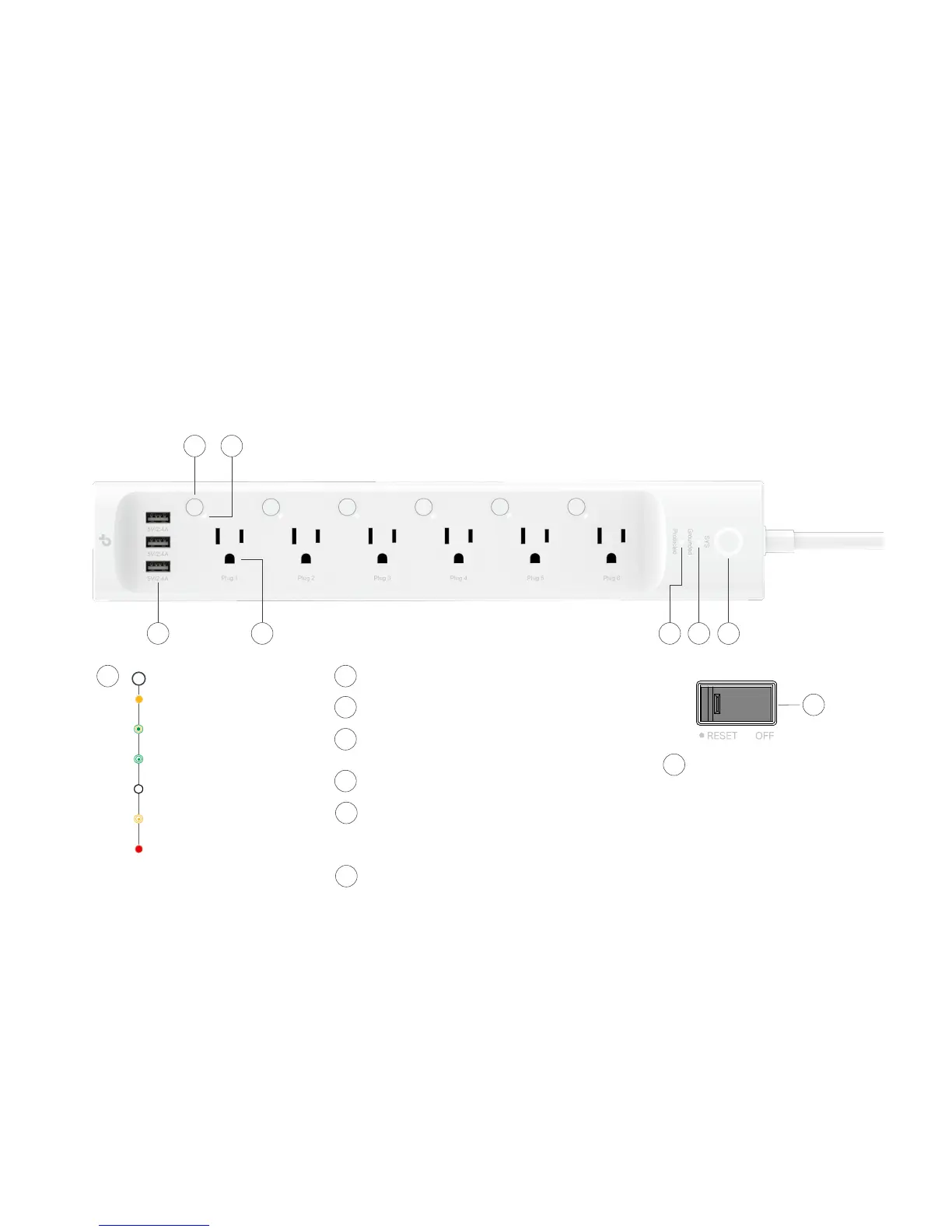 Smart Power Strip has 6 individual smart outlets, with control buttons to turn on/o devices plugged in and LEDs to show you the current status. SYS,