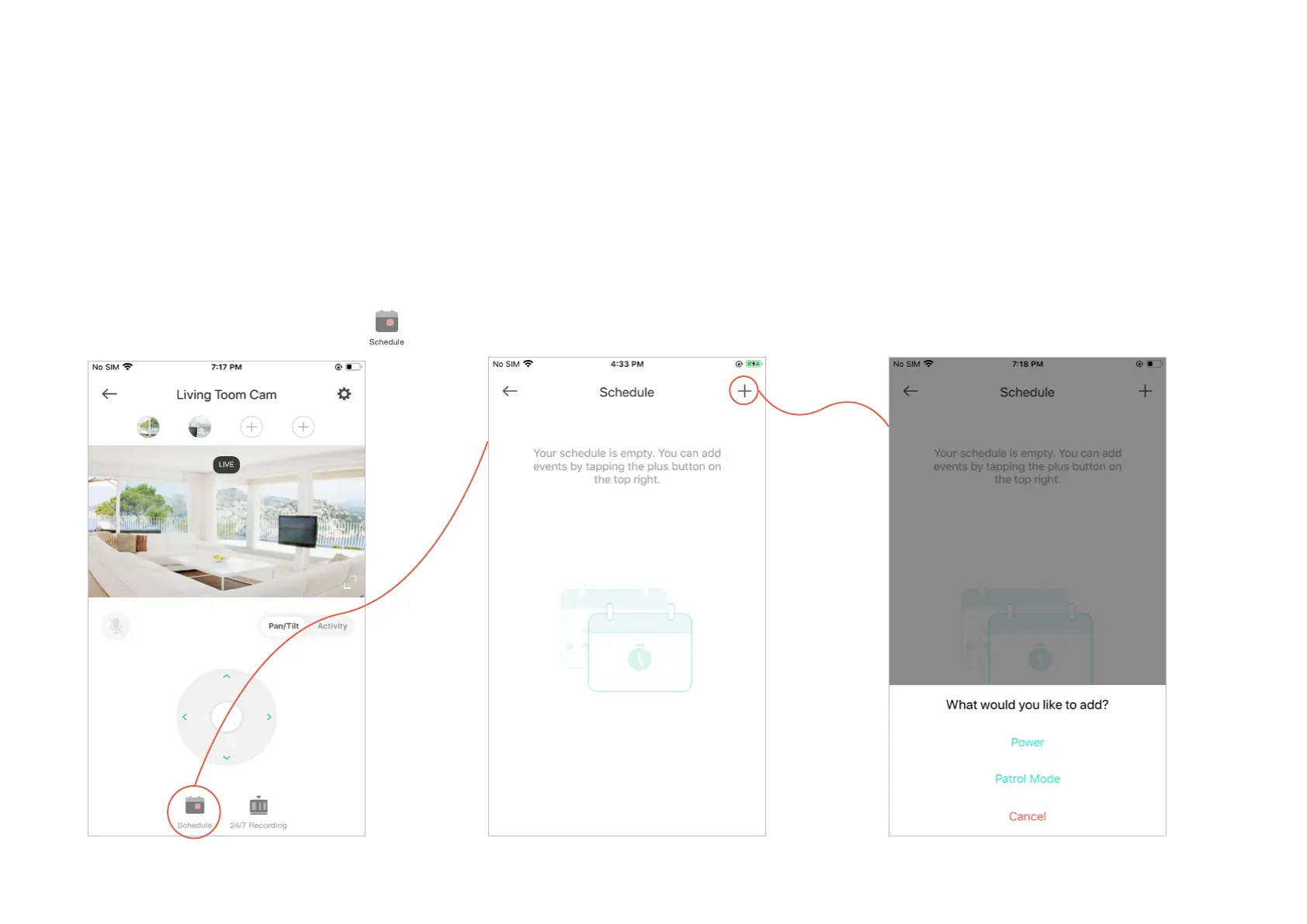 Schedule: Set schedules to automatically turn on/o your camera, or turn on/o patrol mode (the camera