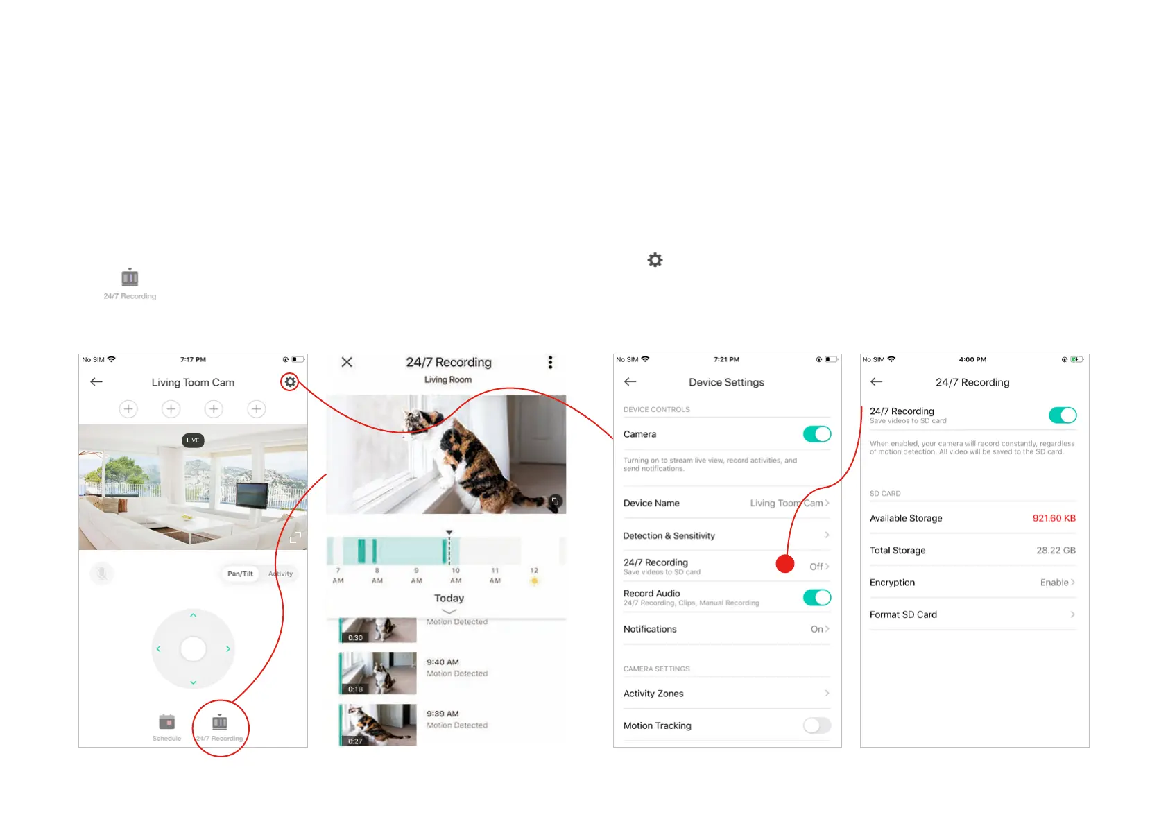 Tap your in the live view page and tap 24/7 Recording. Here you