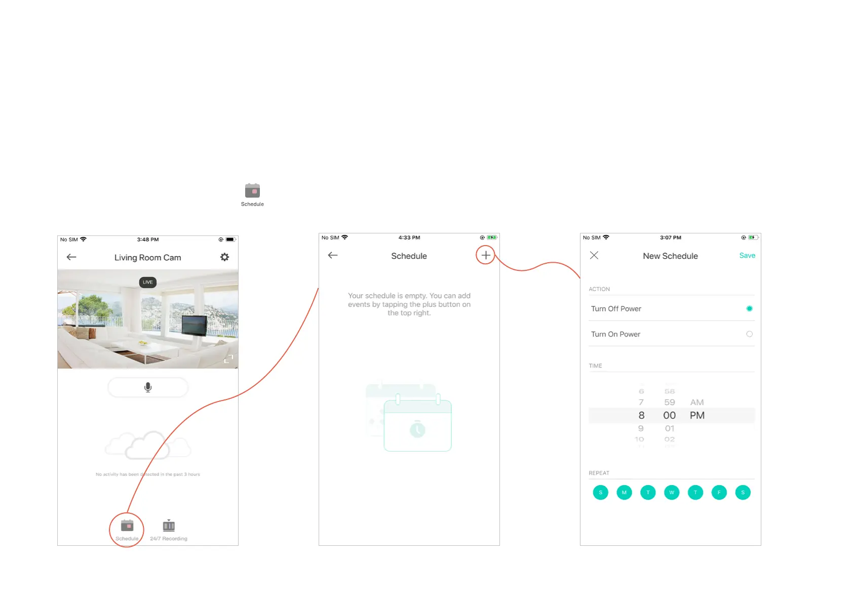 2. Tap + on the top right corner. 3. Set a schedule to turn the camera on or