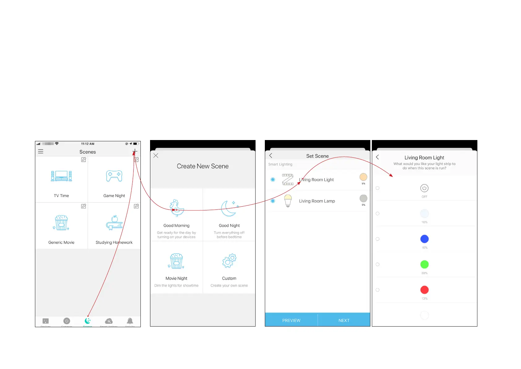 A scene is a preset group of smart devices that can be customized and activated simultaneously at the touch of a button from your smartphone or