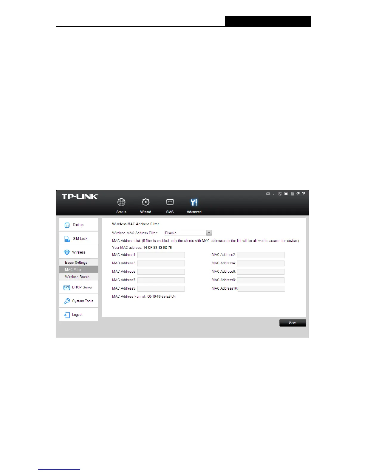 Wireless MAC Address Filter: Select to Enable or Disable the MAC filter function of the