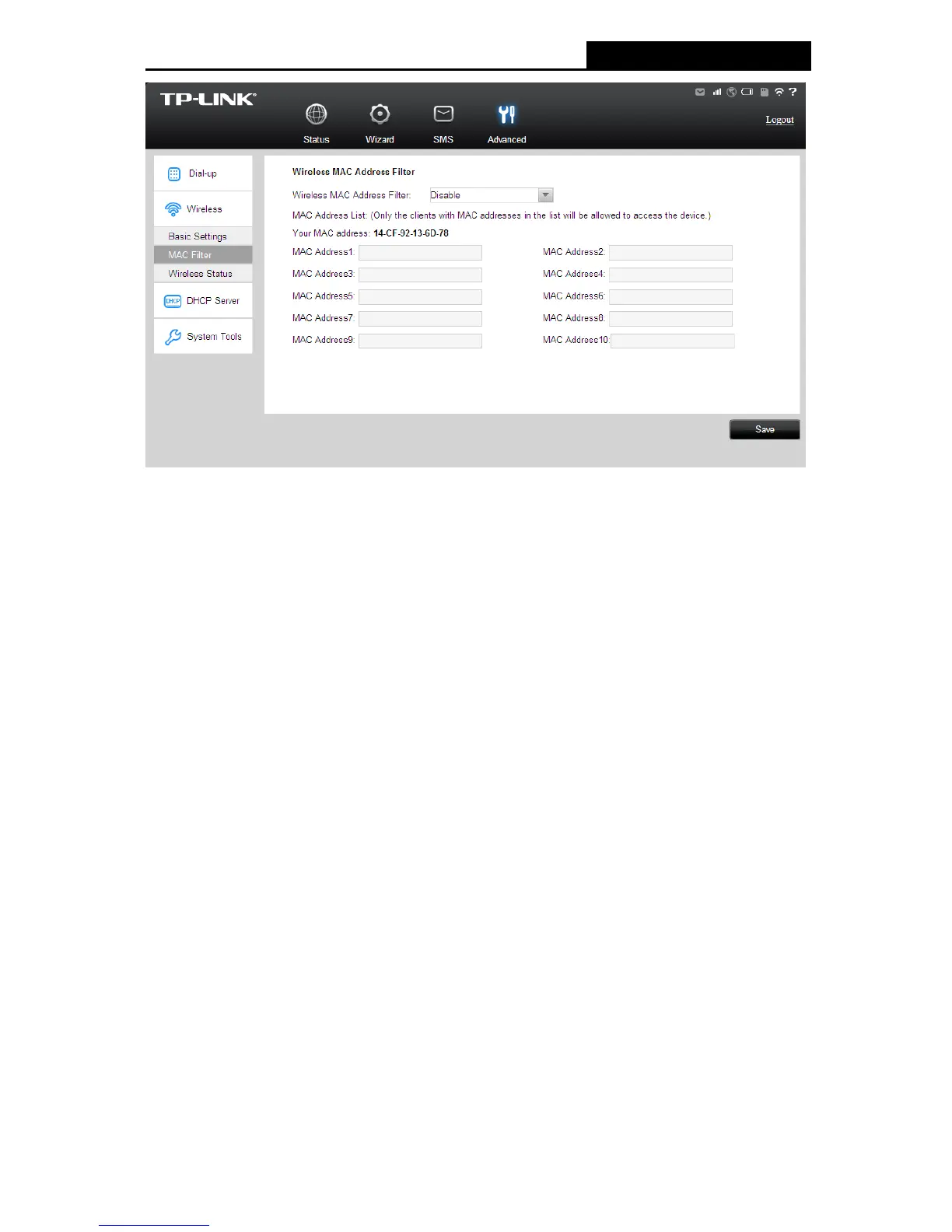 Wireless MAC Address Filter: Select to Enable or Disable the MAC filter function of the