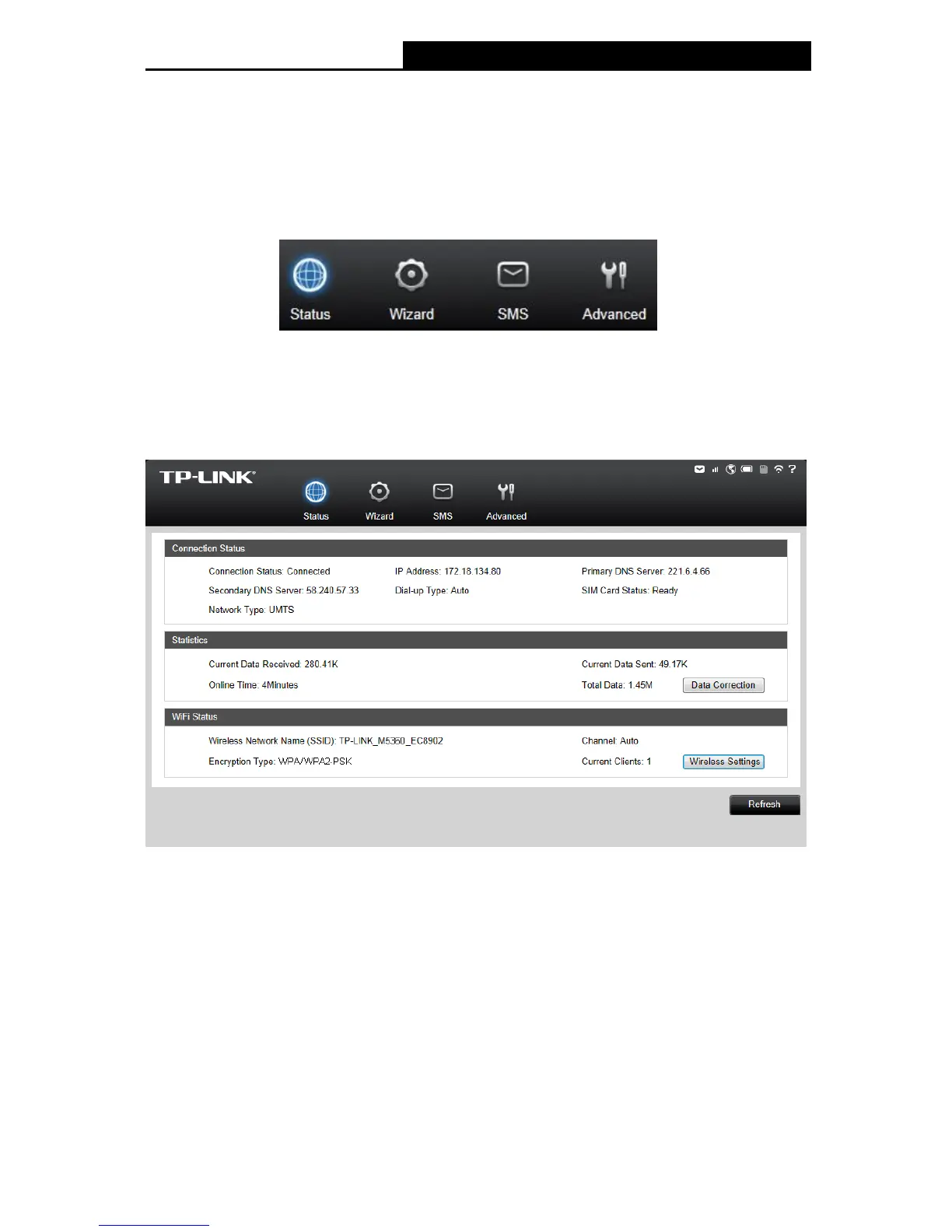 menu listing Status, Wizard, SMS and Advanced on the top. In the following parts, these items
