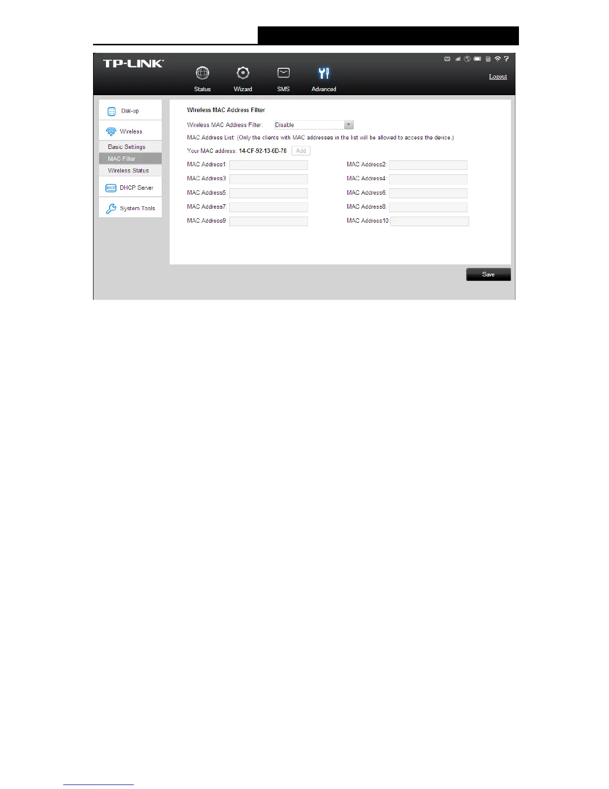 Wireless MAC Address Filter: Select to Enable or Disable the MAC filter function of the