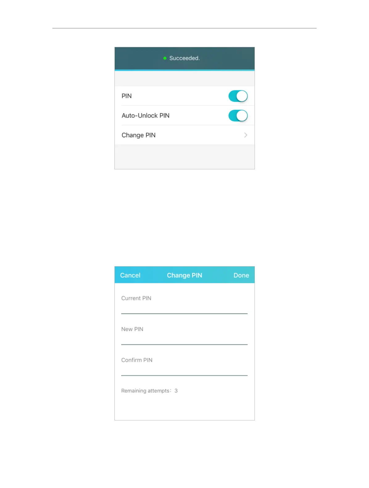 4. Enter the current PIN code and then enter a new PIN code twice.