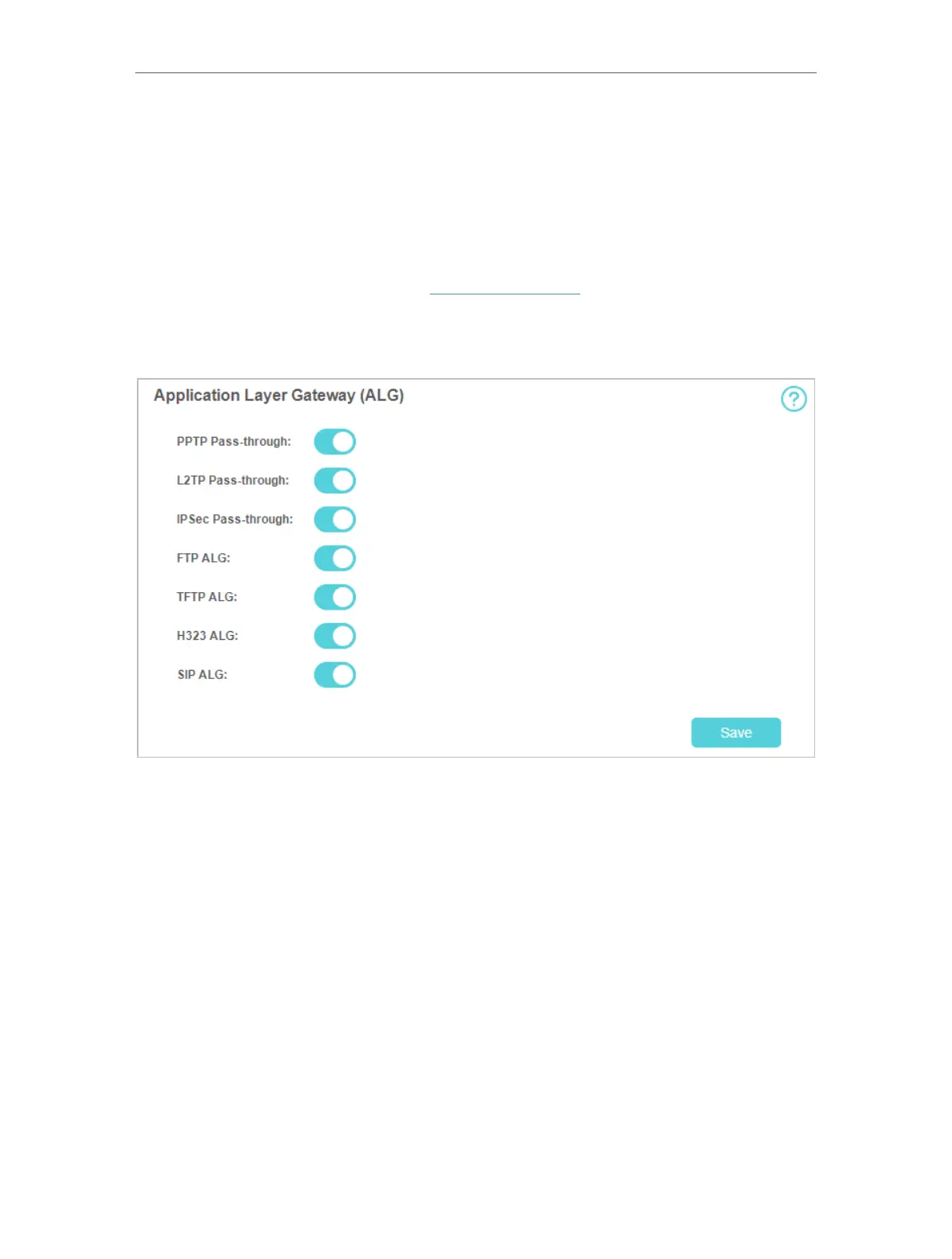 • TFTP ALG: If enabled, it allows TFTP (Trivial File Transfer Protocol) clients and servers