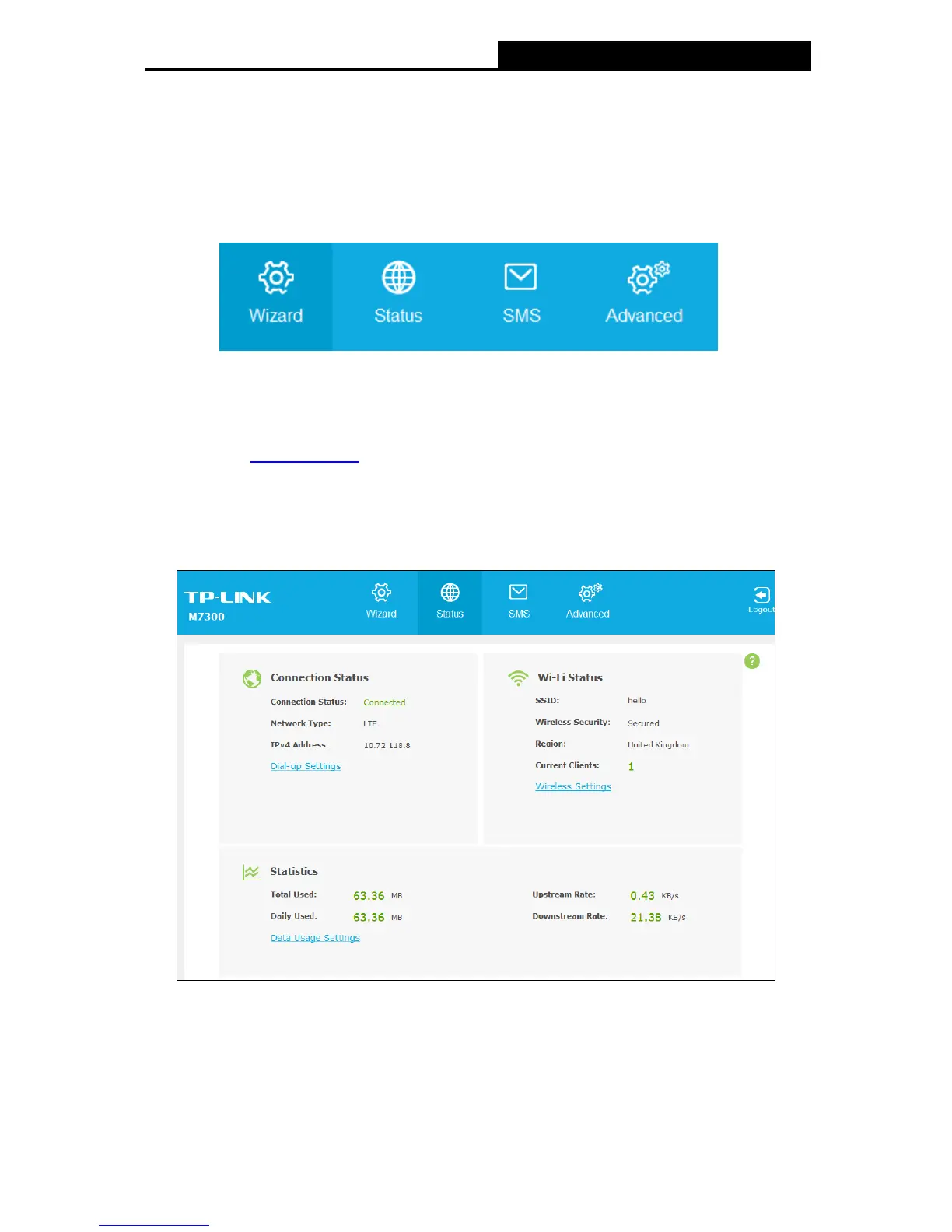 menu listing Wizard, Status, SMS and Advanced on the top. In the following parts, these items
