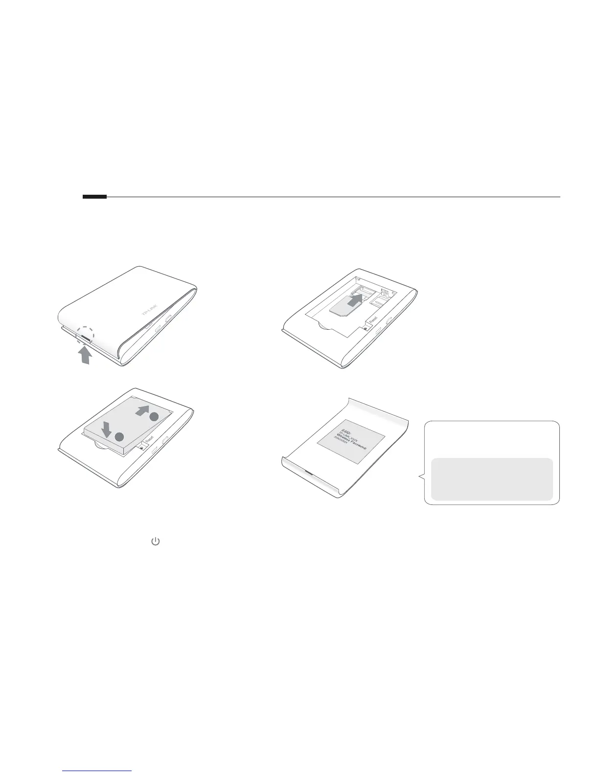 Remove the cover, and install the SIM card and battery as shown.