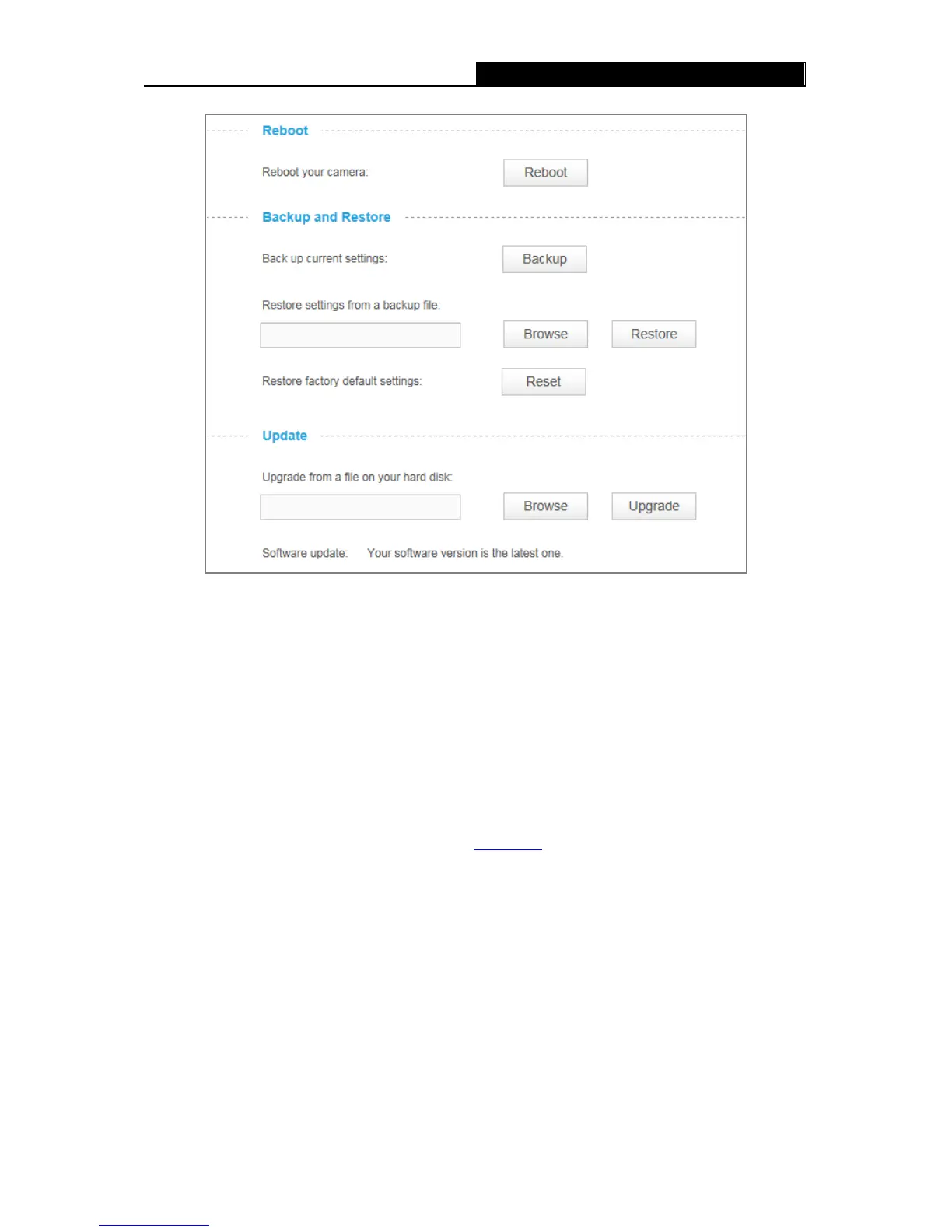 Restore: Click Browse to locate the saved backup file and then click Restore. The camera