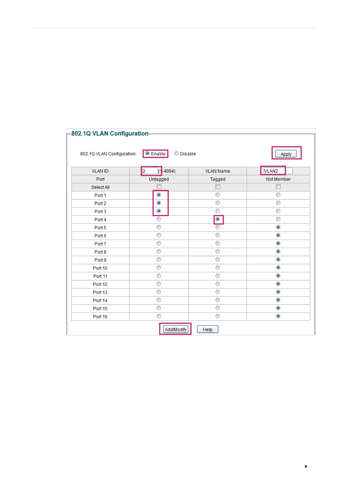 name as VLAN2. Select port 1, port 2, port 3 as untagged ports. Select port 4 as a
