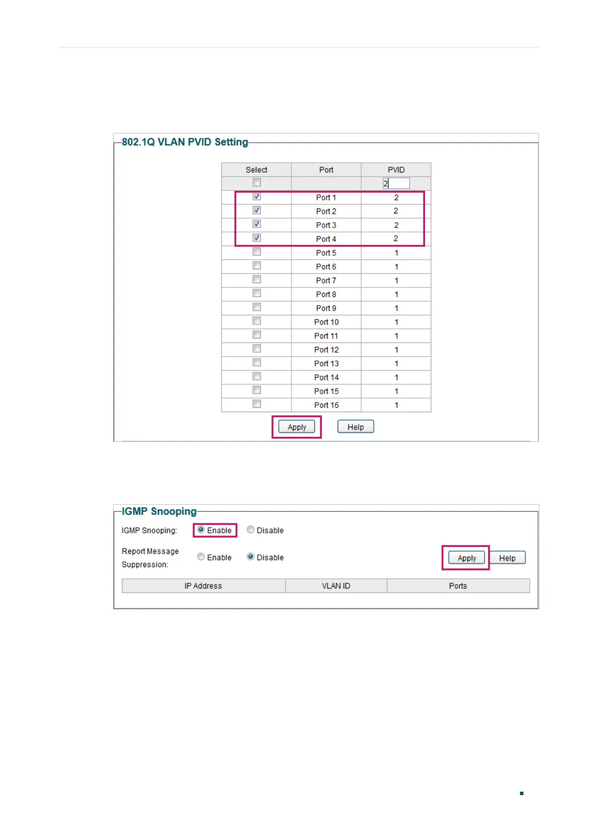port 2, port 3 and port 4, and specify the PVID as 2 for the ports. Click Apply.