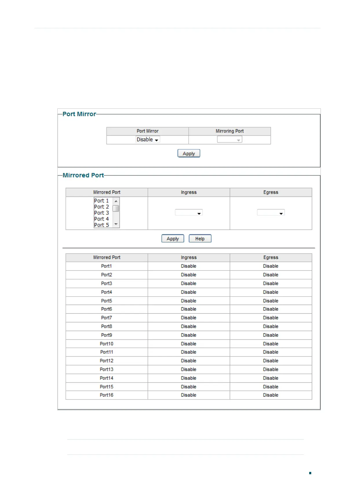 1) Enable the port mirror feature globally. Specify a mirroring port. Click Apply.