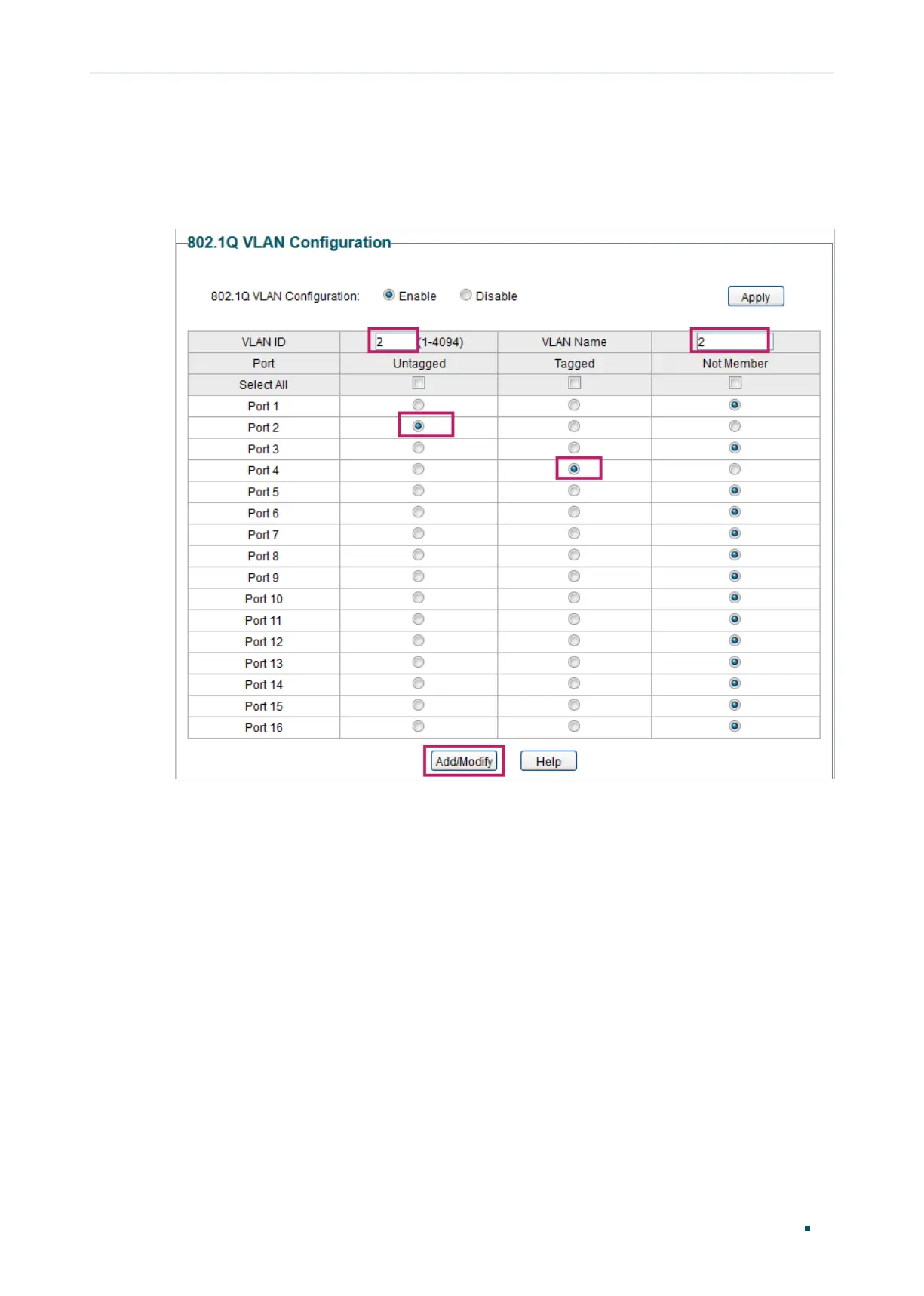 Specify VLAN ID as 2, add port 2 to the VLAN as an untagged port, and add port 4 to the