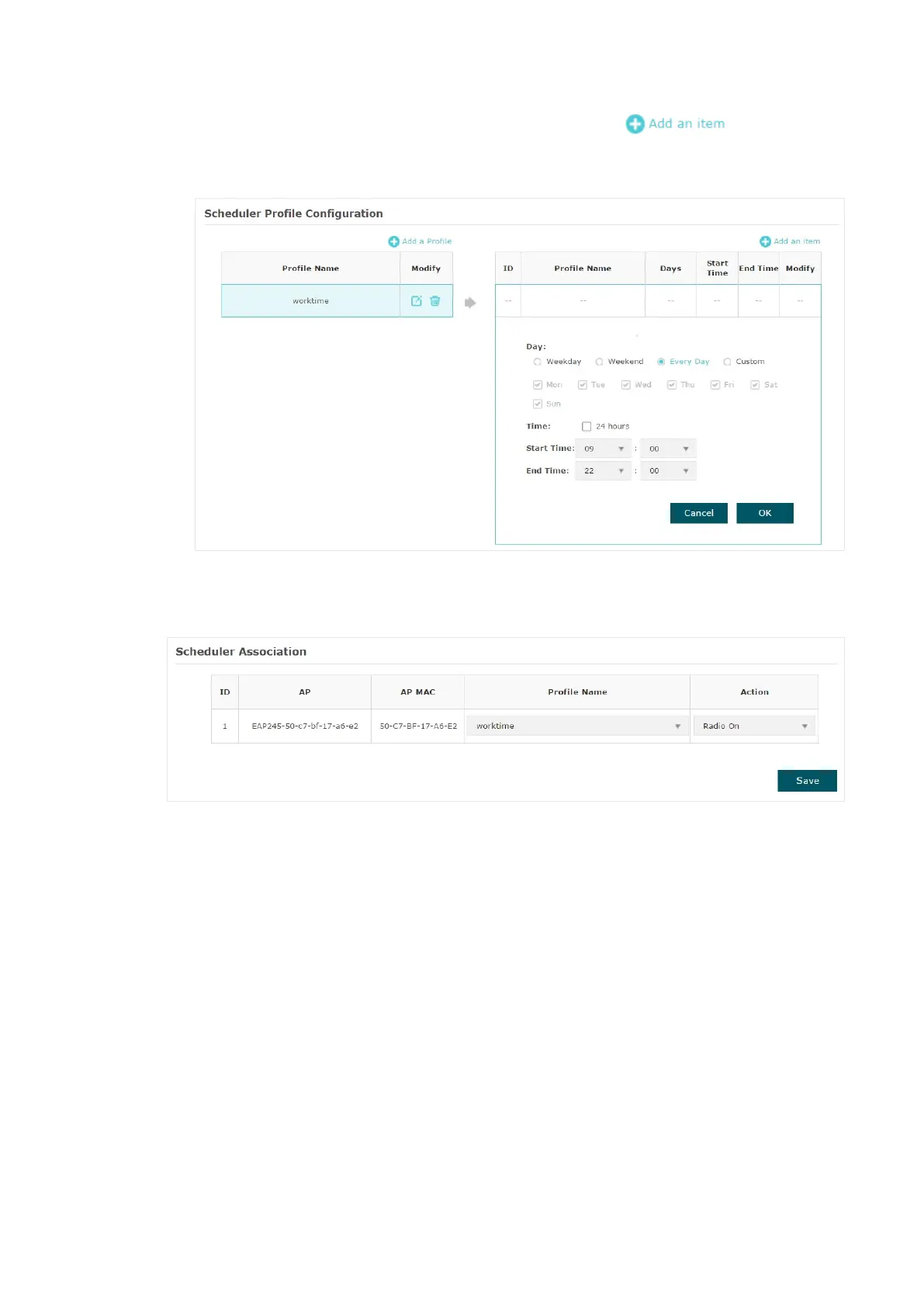 4. In the Scheduler Association section, select “worktime“ in the Profile Name column