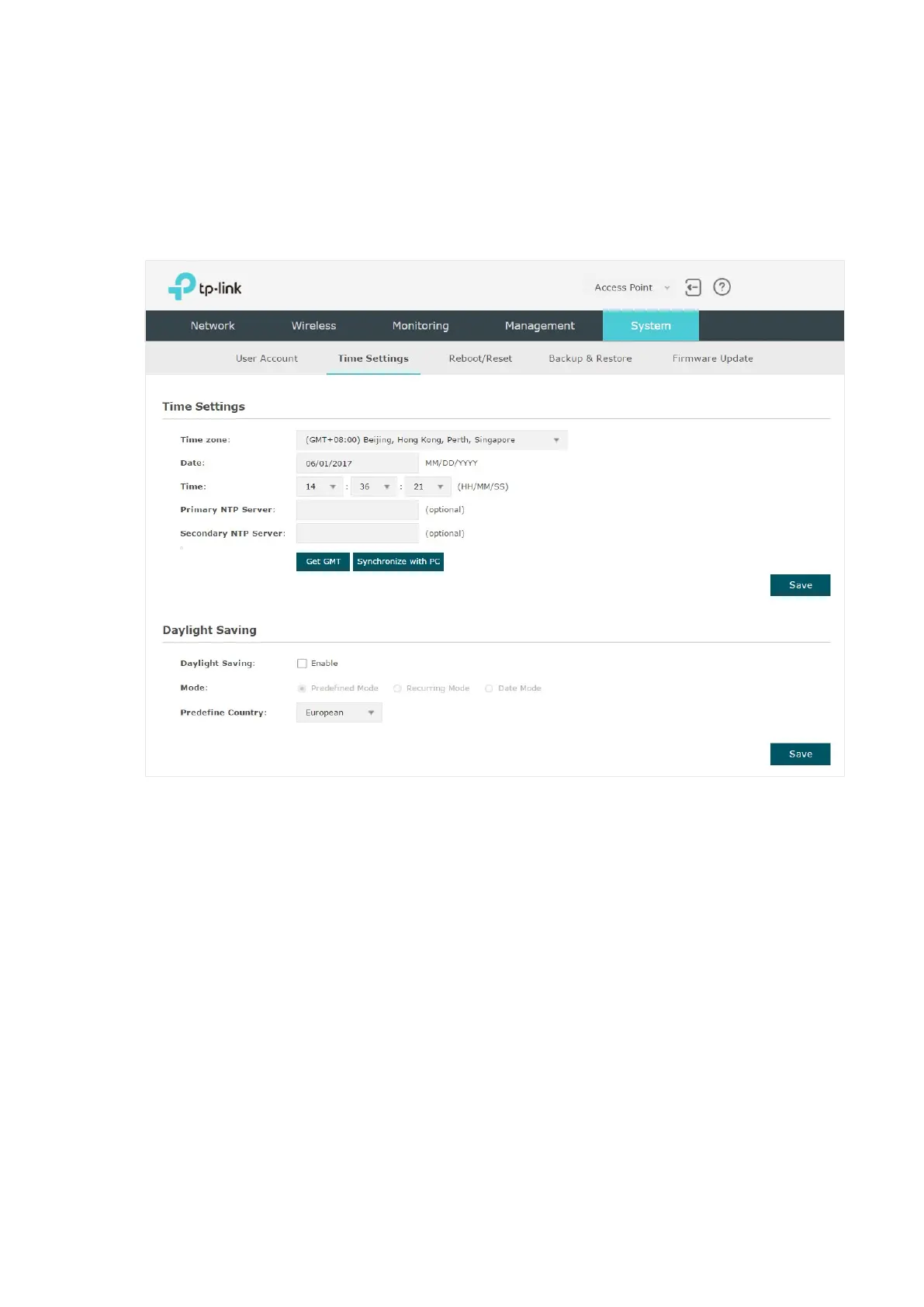 supports the basic system time settings and the Daylight Saving Time (DST) feature.