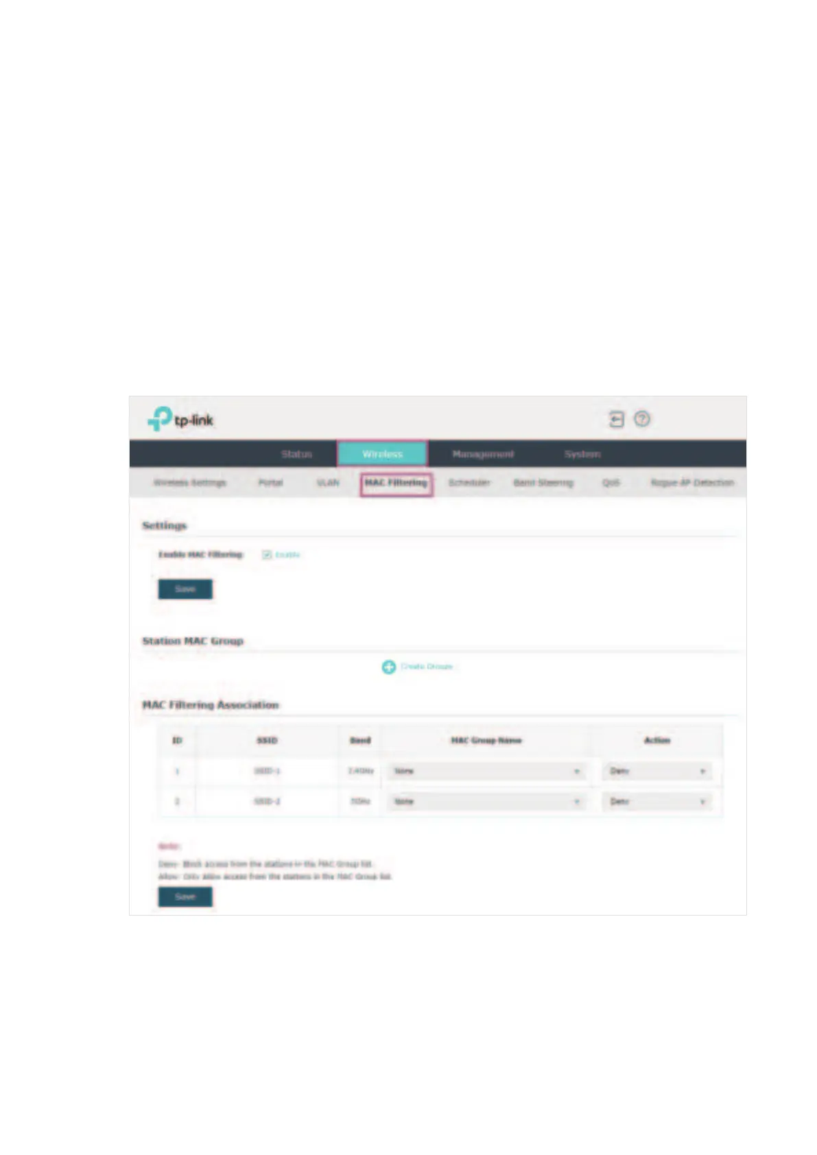 To configure MAC Filtering, go to the Wireless > MAC Filtering page.