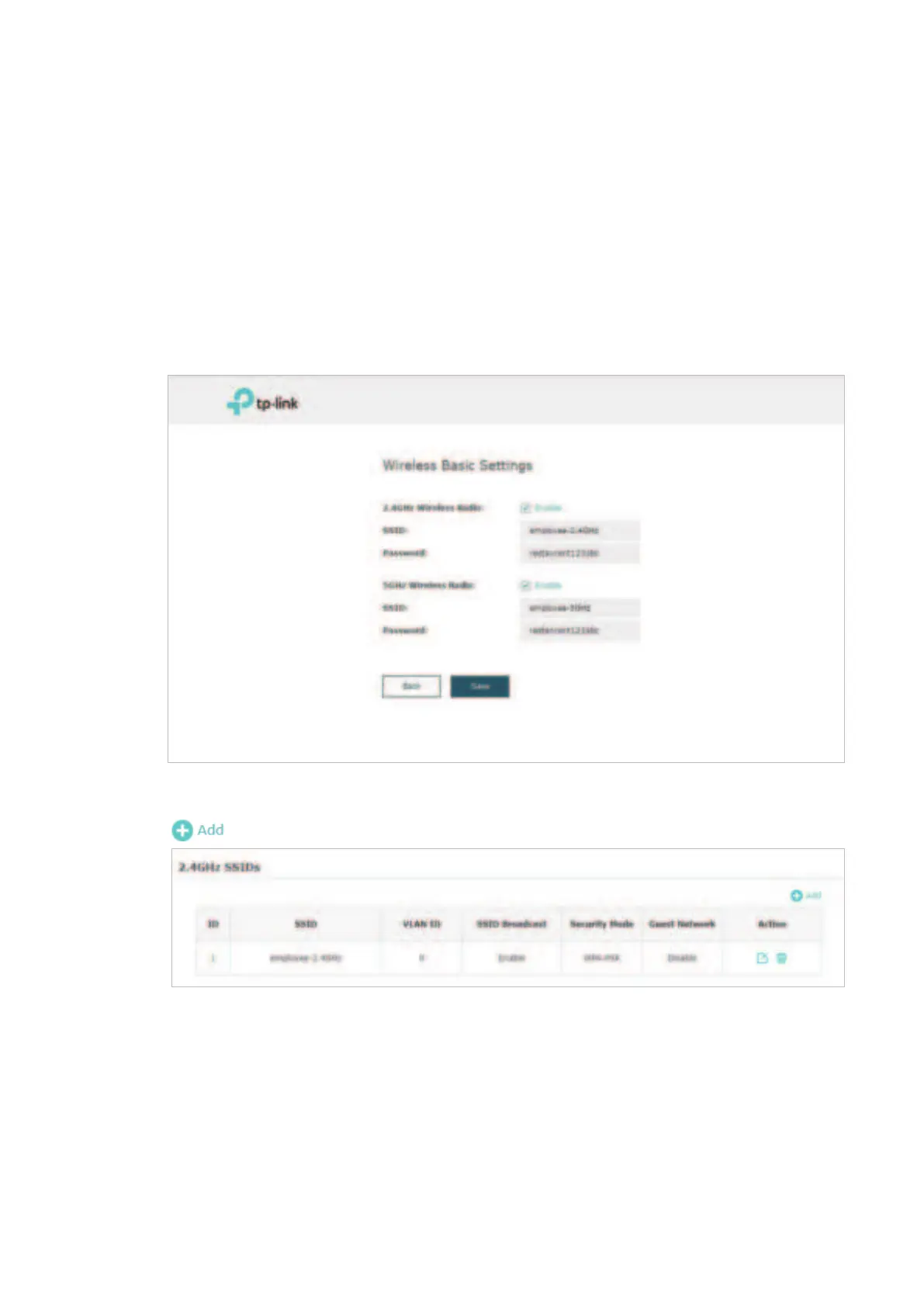 2. Go to the Wireless > Wireless Settings page. Create SSIDs for guests on 2.4GHz. Click
