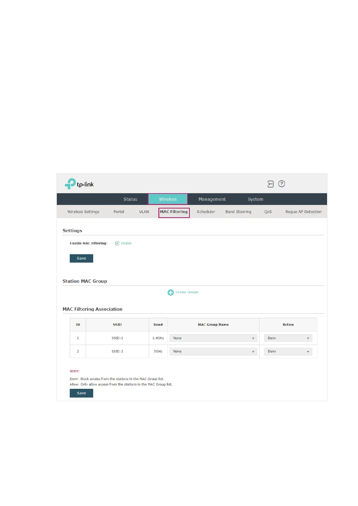To configure MAC Filtering, go to the Wireless > MAC Filtering page.