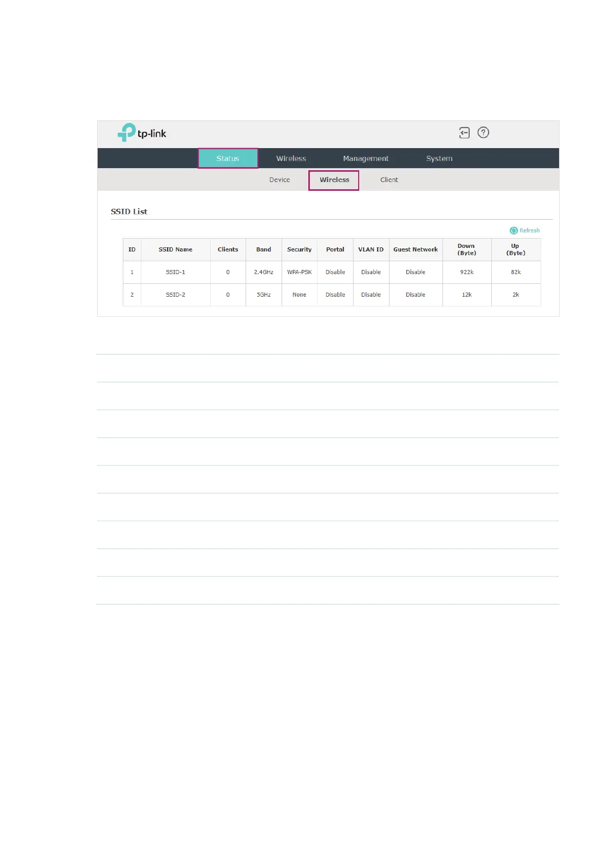 Down (Byte) Displays the total download traffic since the SSID starts working.