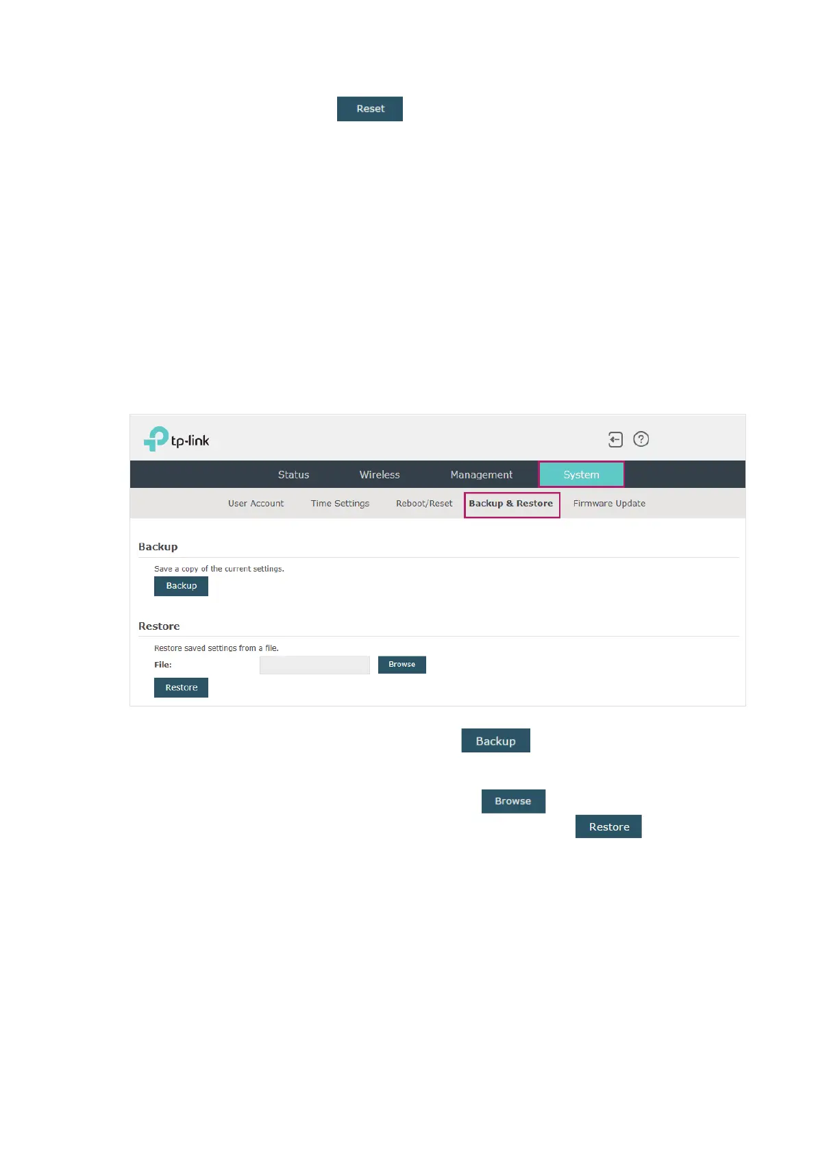 To backup and restore the configuration, go to the System > Backup&Restore page.