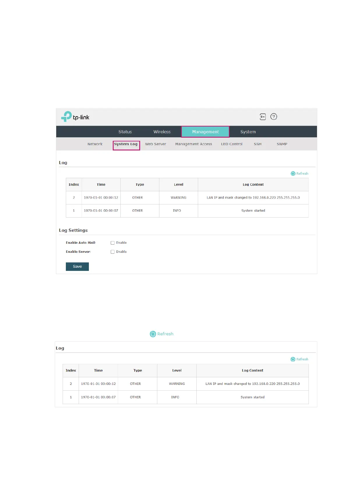 To manage system logs, go to the Management > System Log page.